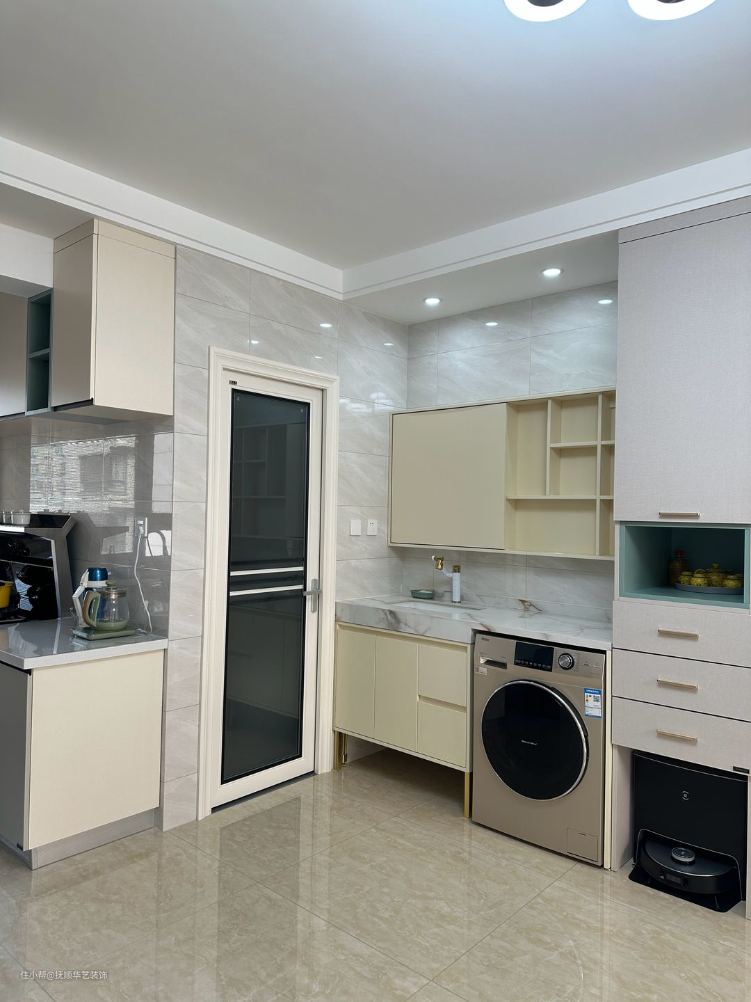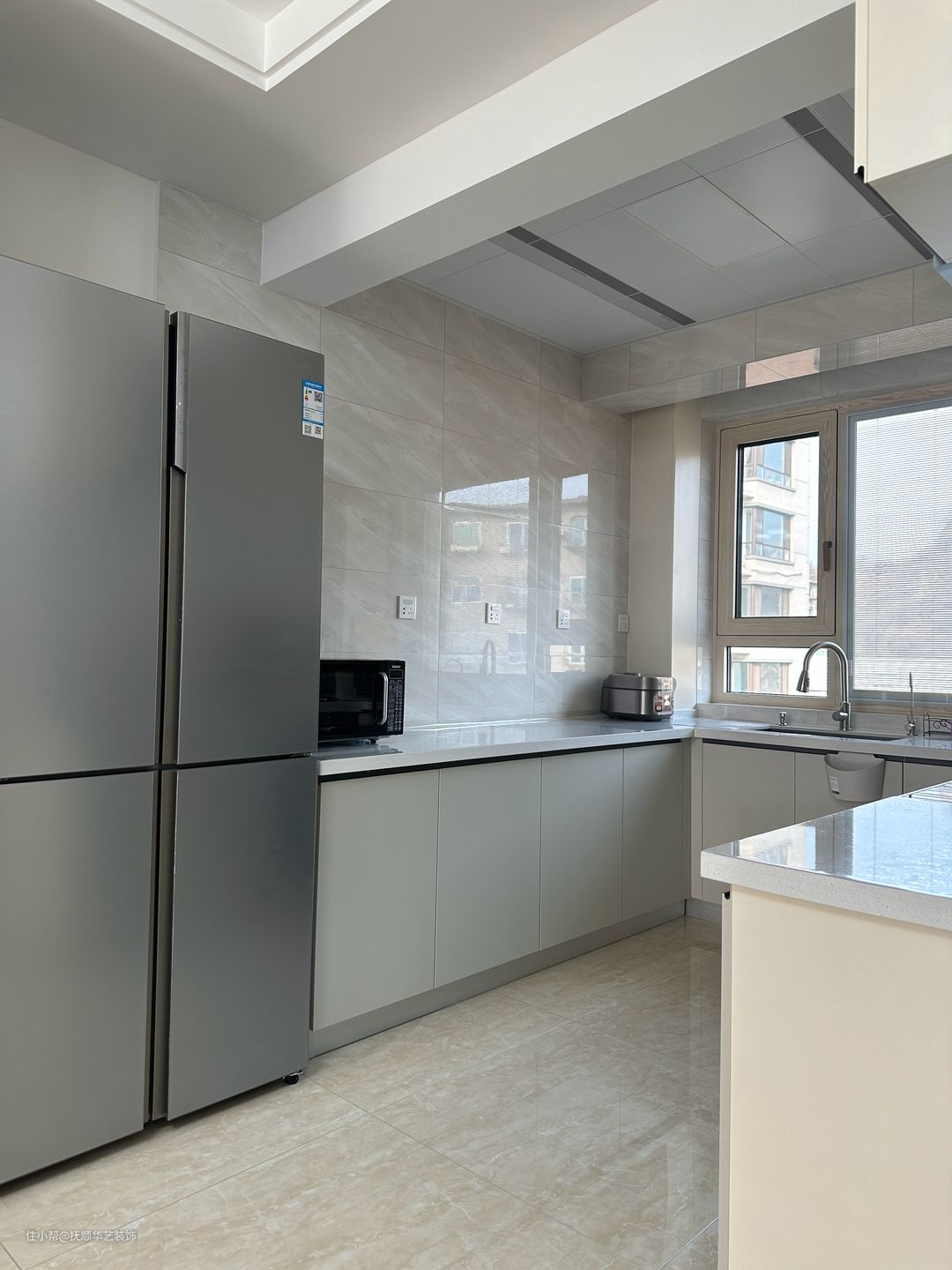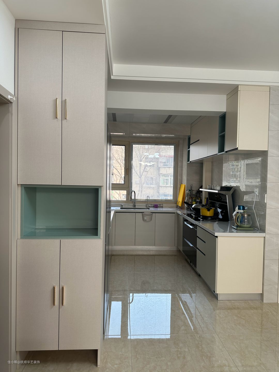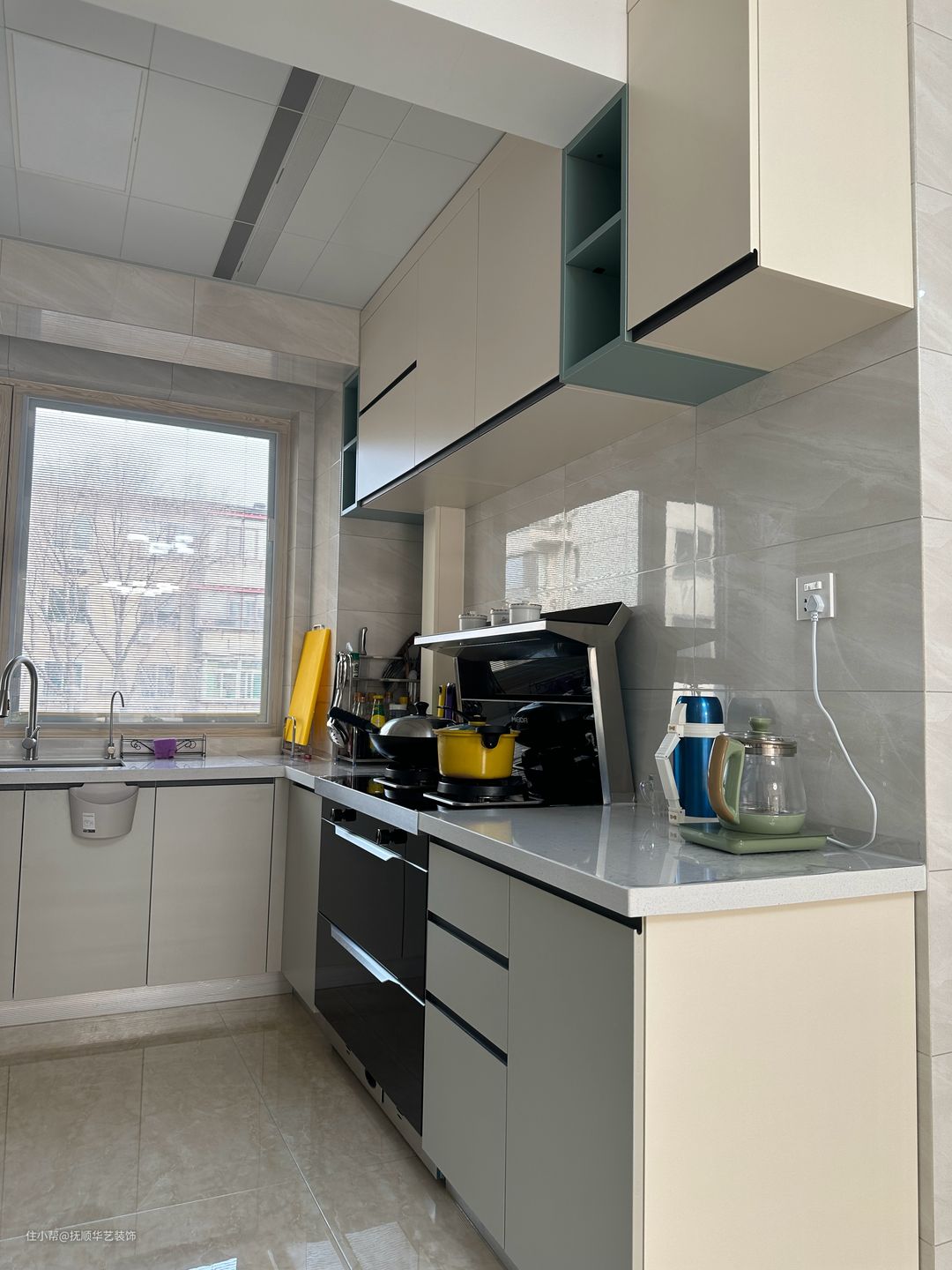 厨房做开放式厨房设计,u型橱柜设计,合理的规划了动线,让做饭的过程更加的舒适与轻松,白色的墙面与橱柜,搭配大面积的窗户,让整个厨房空间视觉上更加通透明亮。
