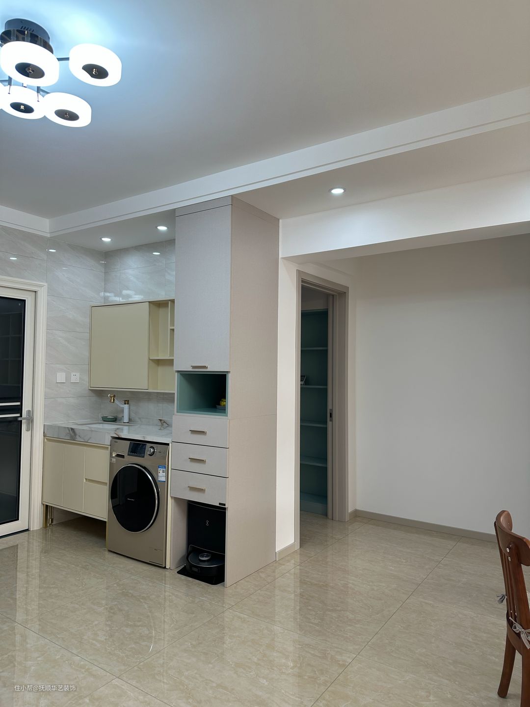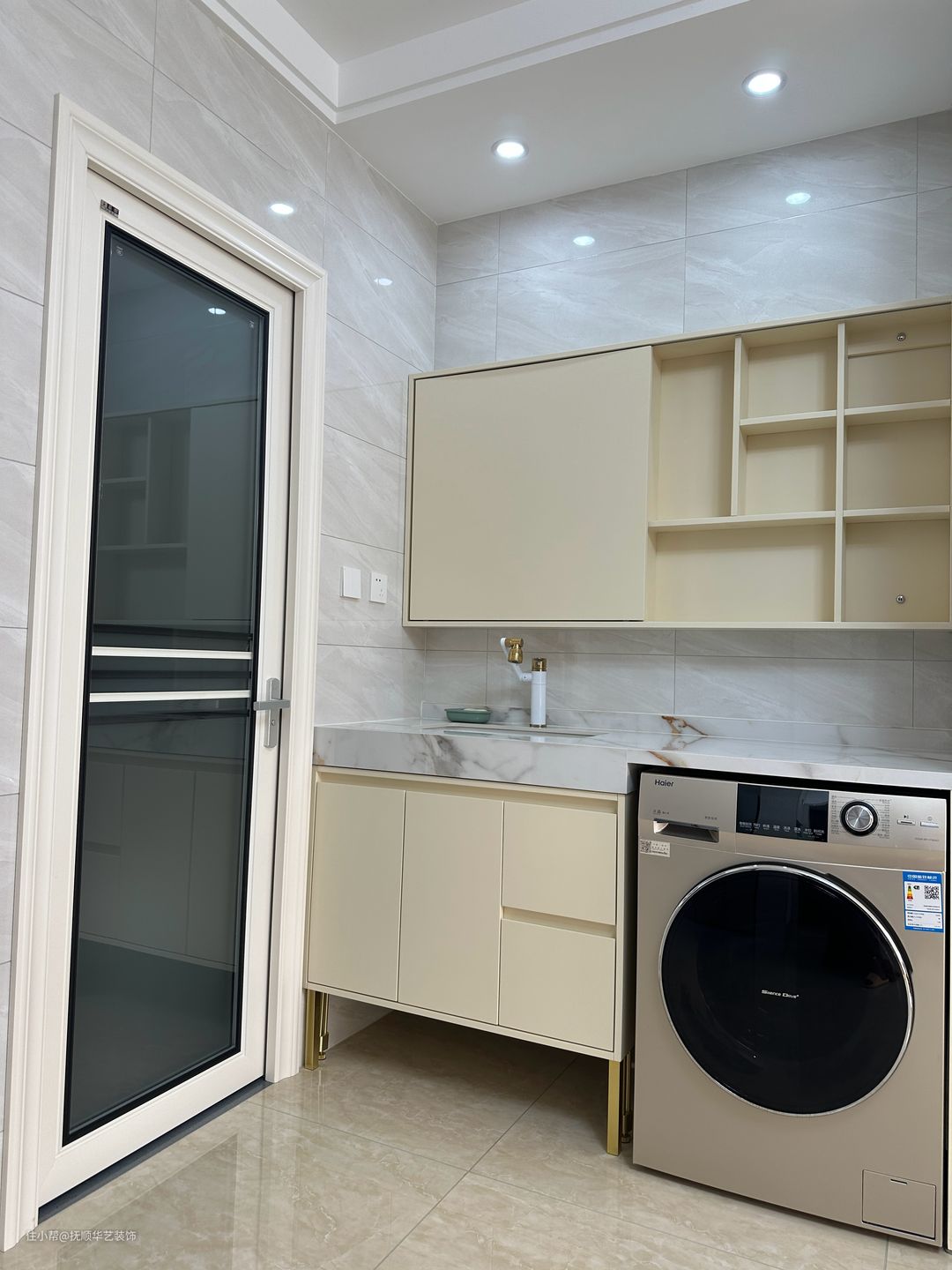 卫生间干湿区分开设计,洗手池外置,安装定制吊柜一侧留空嵌入洗衣机。上方安装镜柜,开放格设计能收纳更多小物品,增加利用率,让台面更加整洁。