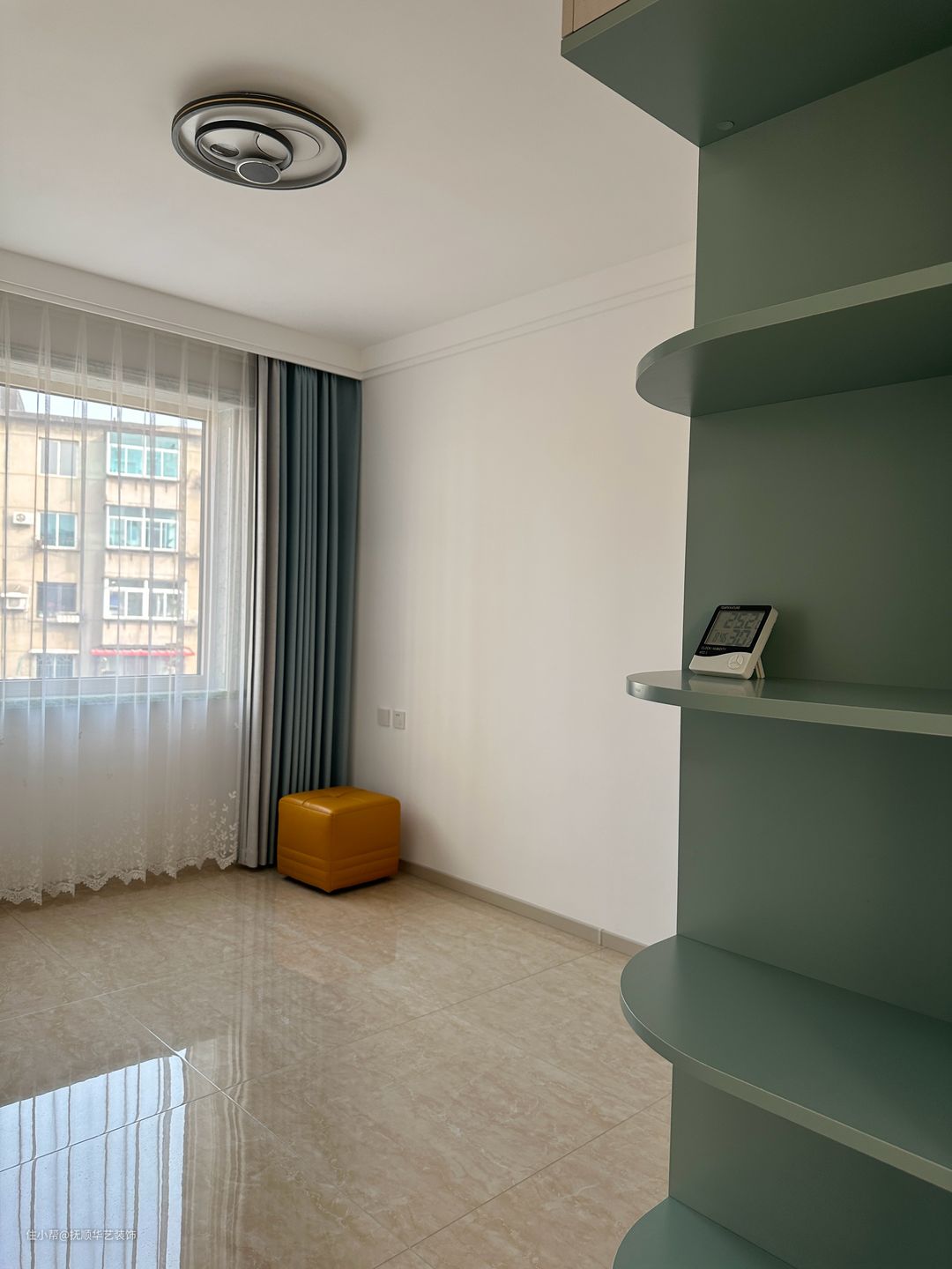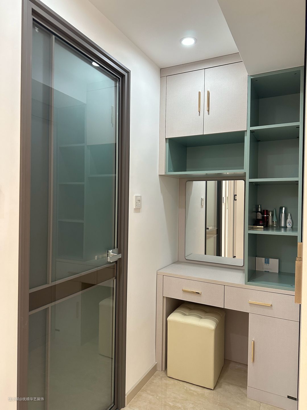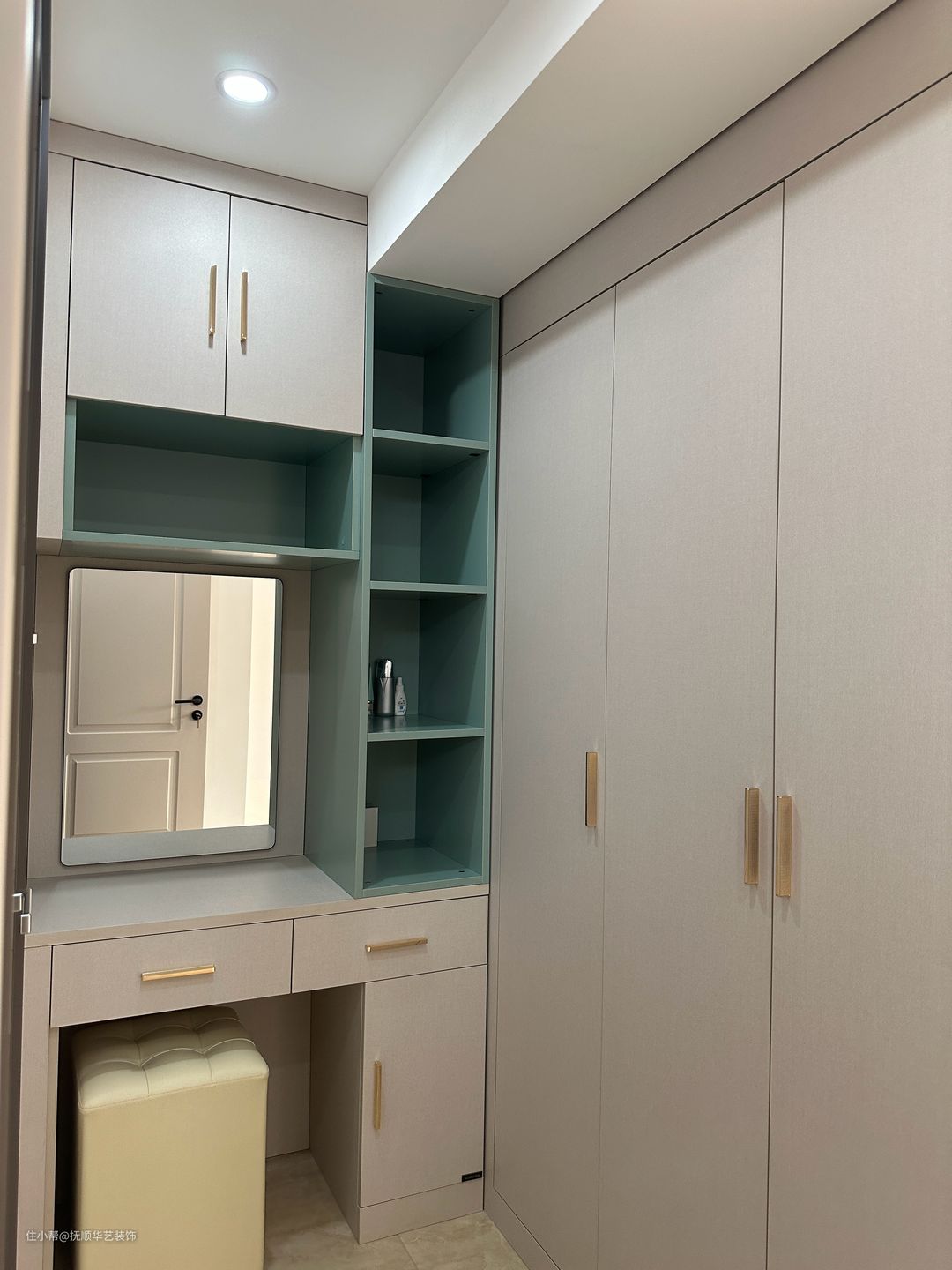 主卧整体以浅色为主,绿色橱柜搭配同色的窗帘,让空间更加干净温馨。主卧走廊处做橱柜+化妆台设计,既节省了空间又增加了隐私性。