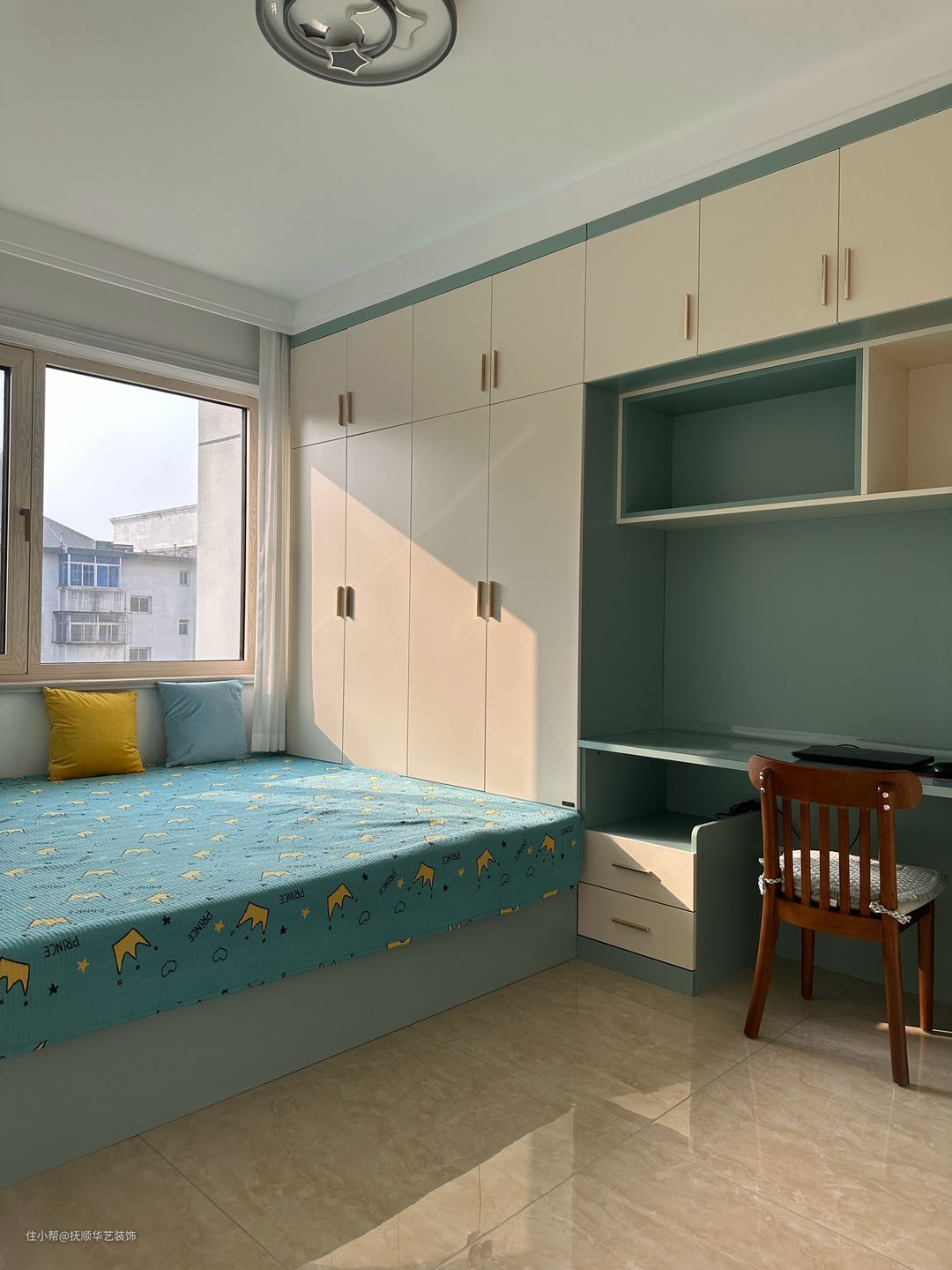 次卧做榻榻米+书桌设计,白色与绿色相互穿插,让空间十分清新舒适,满墙的衣柜与书桌连贯设计,满足更多地收纳需求。平时办公学习等方面也更加方便。