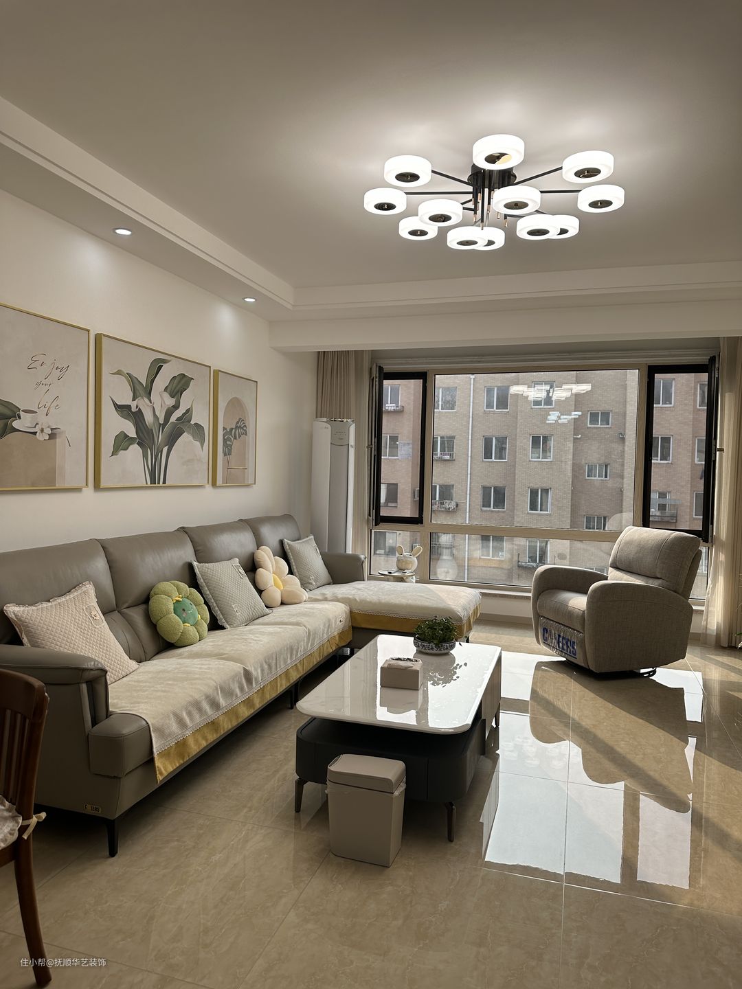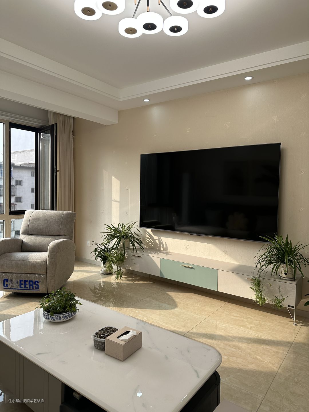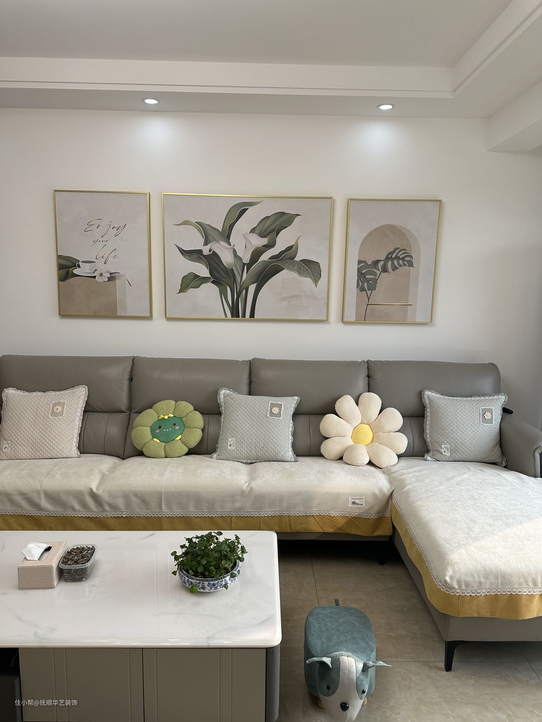 以浅色为主基调的客厅,整个空间显得明亮干净清爽,四周简单双眼皮吊顶提升空间的层高,选择简单质感的家具,彰显朴素大气之美。米黄色的电视背景墙,简约又不失高级感。沙发背景墙为简单的大白墙,挂上三幅装饰画,布置上灰色皮艺沙发,呈现出鲜明的层次感和节奏韵律,在朴素的生活里,拥抱这份岁月静好。