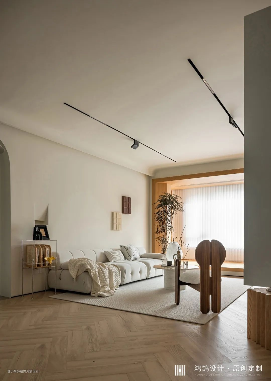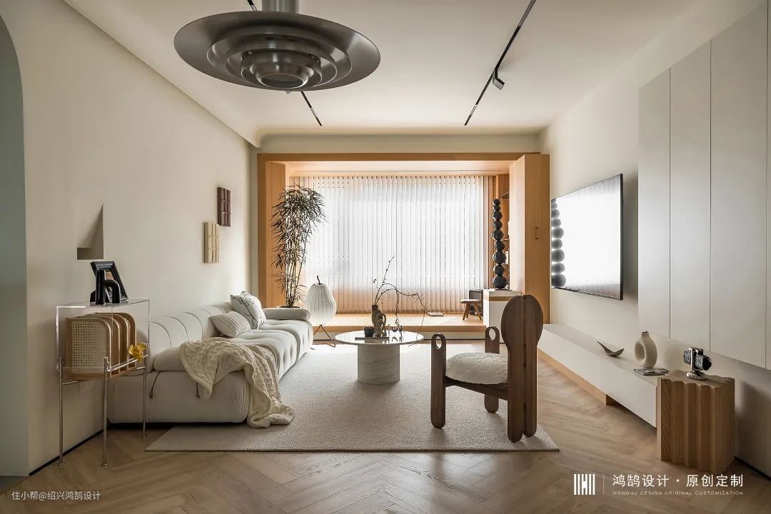 格局上把整个客厅空间打开,我们想要大平层的空间感。充分发挥2.95m层高优势,无主灯+满吊顶设计,以及线条元素叠加使用(磁吸轨道+吊顶弧形挂边+黑色哑光不锈钢极窄踢脚线…),能够有效拉伸整个客厅的空间长度。新西兰进口纯羊毛地毯脚感温和舒适,家人围坐或朋友聚会满足多重生活场景。 沙发背景墙面以简洁的设计为基础,通过切割墙洞与石膏板造型,将壁龛打造为艺术造型“壁灯”。两幅立体装饰画在设计之初就提前预想好了点位,后期软装阶段通过设计师现场定位安装完成。