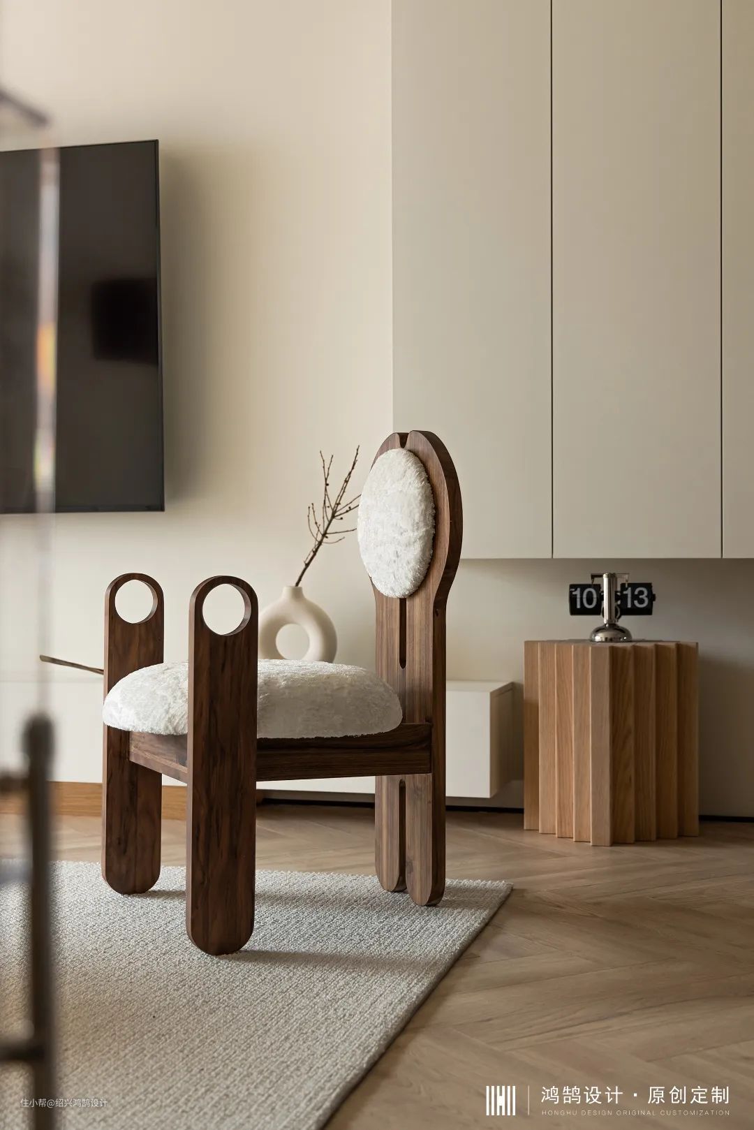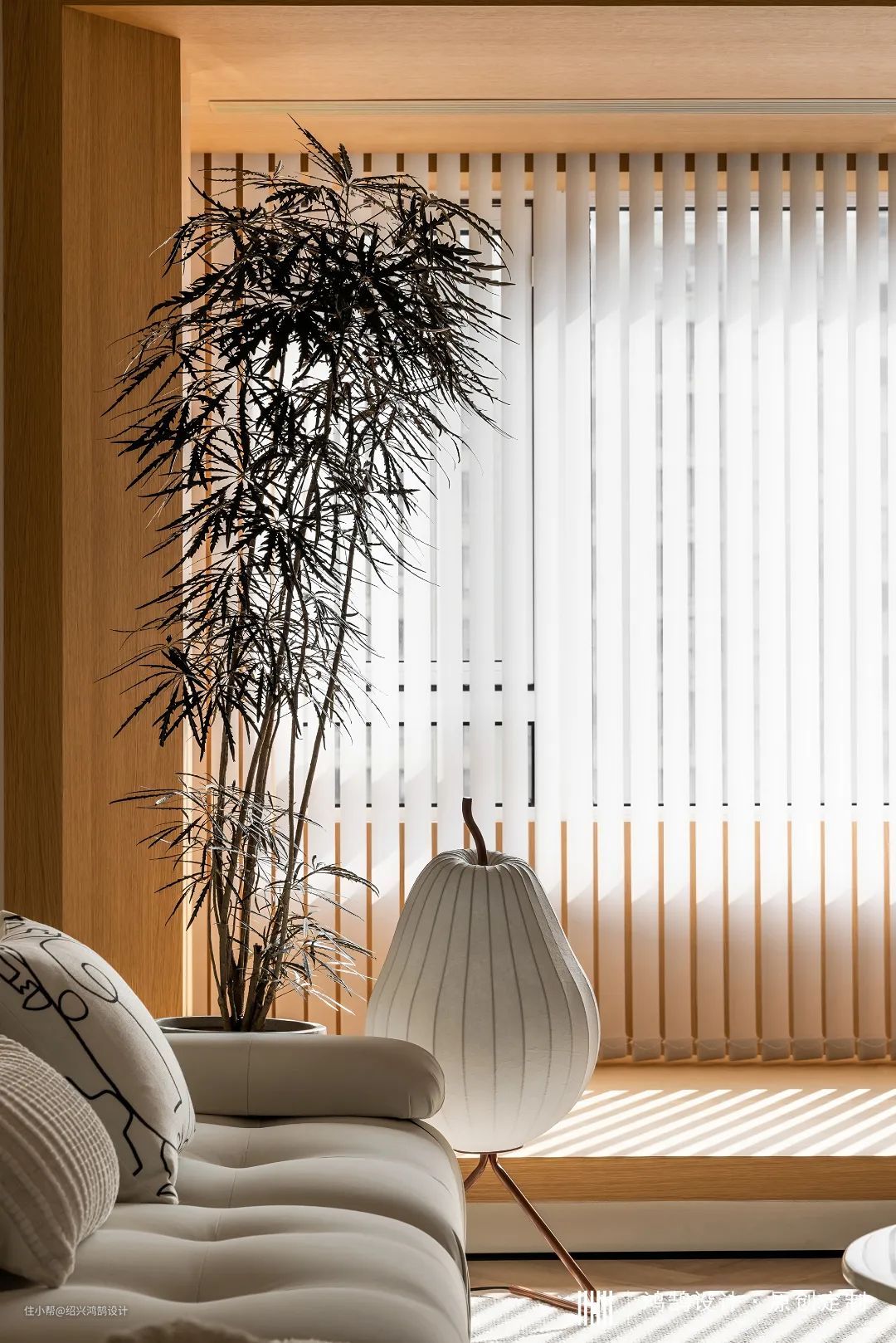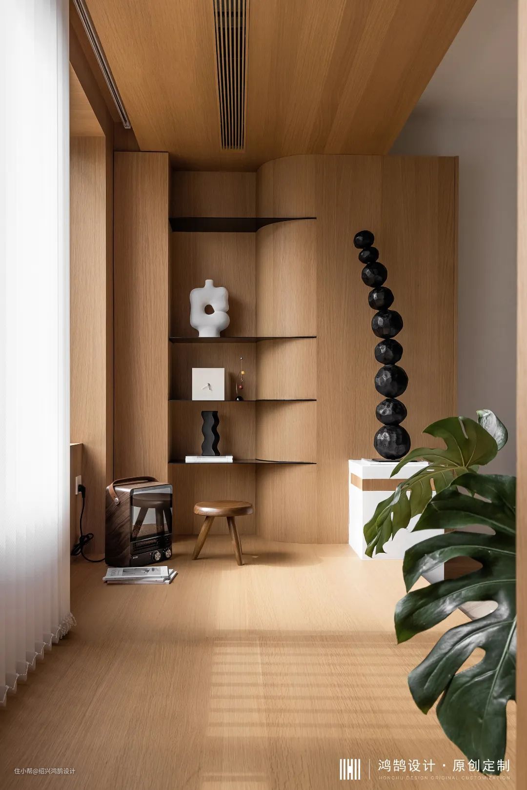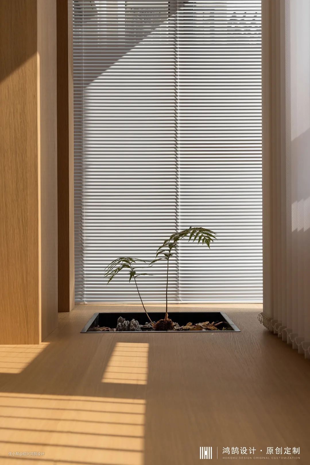为了保证客厅层高,我们将中央空调内机位置移至阳台顶部,通过压缩局部空间来达到大环境的舒适,同时将阳台“木盒子”结构向室内延伸,从原先1.1m宽度阳台扩宽至1.5m,提升整个休闲区域的舒适性,家中洗衣晾晒等功能统统移至家政间来完成。 靠电视背景的一侧,我们做了开放的层板与带柜门的柜子,还有一个抽拉式的大怪物,不同形式的柜子用来满足不同生活场景,生活中坐在木盒子里陪小朋友看书,或只是单纯坐着晒晒太阳发发呆,享受美好的居家生活。 在这个“盒子”一侧地面挖出格子做了一个小小的“菜园”,也是家中的景观区,闲暇之余种植蔬菜、水果,满足小朋友对大自然的好奇心,在成长的过程中又增添了一丝野趣。