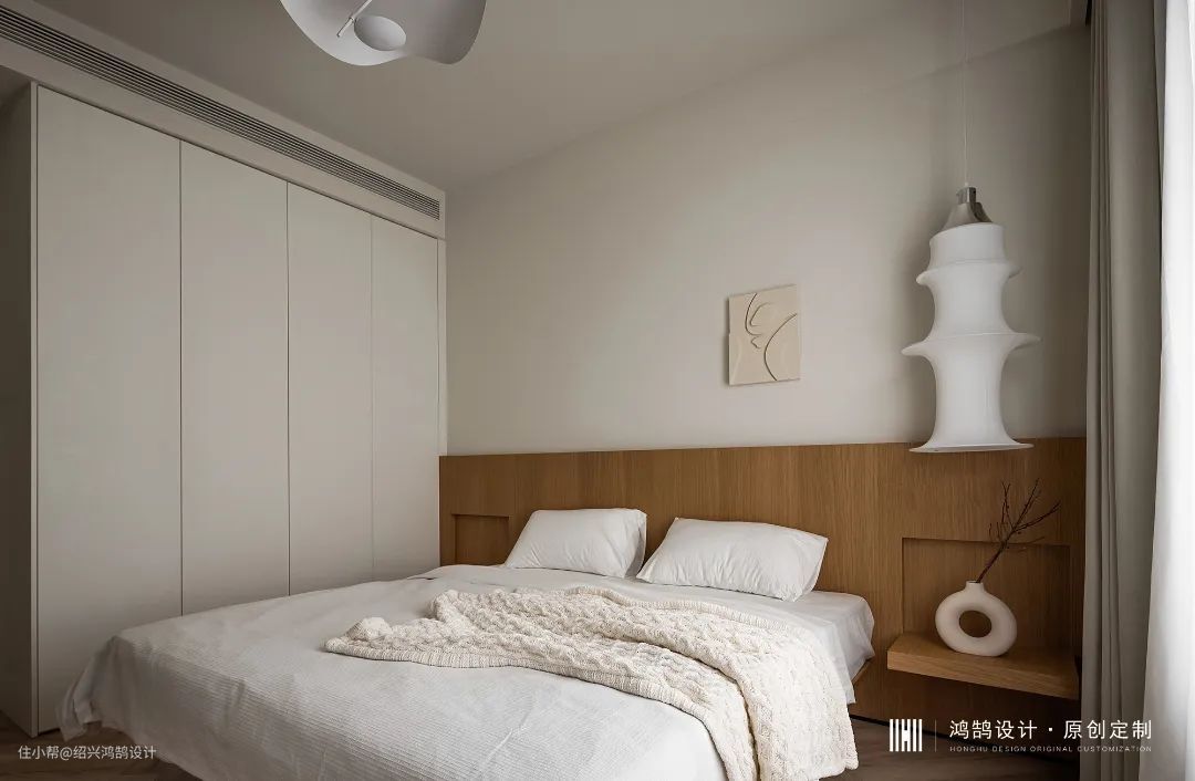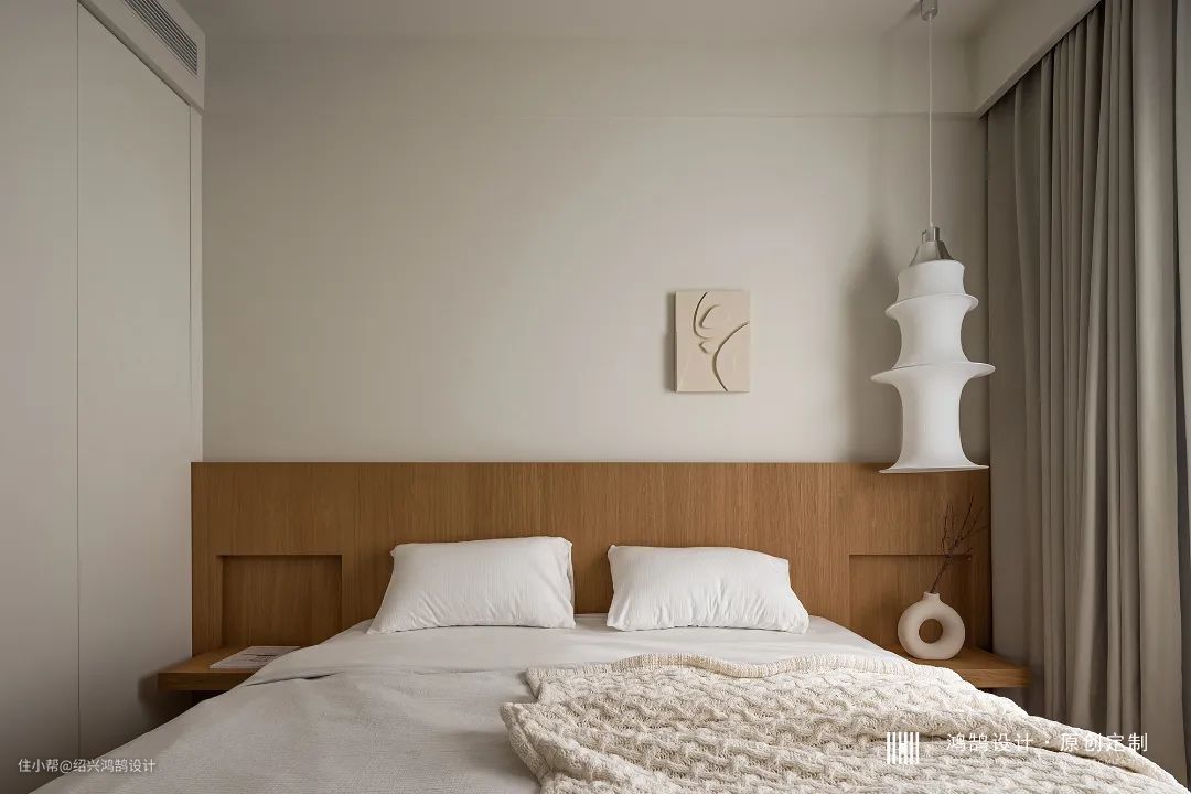 主卧背景半墙造型设计,具有拉伸层高的视觉效果,进而选择了无靠背箱式床体,深色木饰面与阳台盒子同色,床头柜与背板现场制作一体式设计。