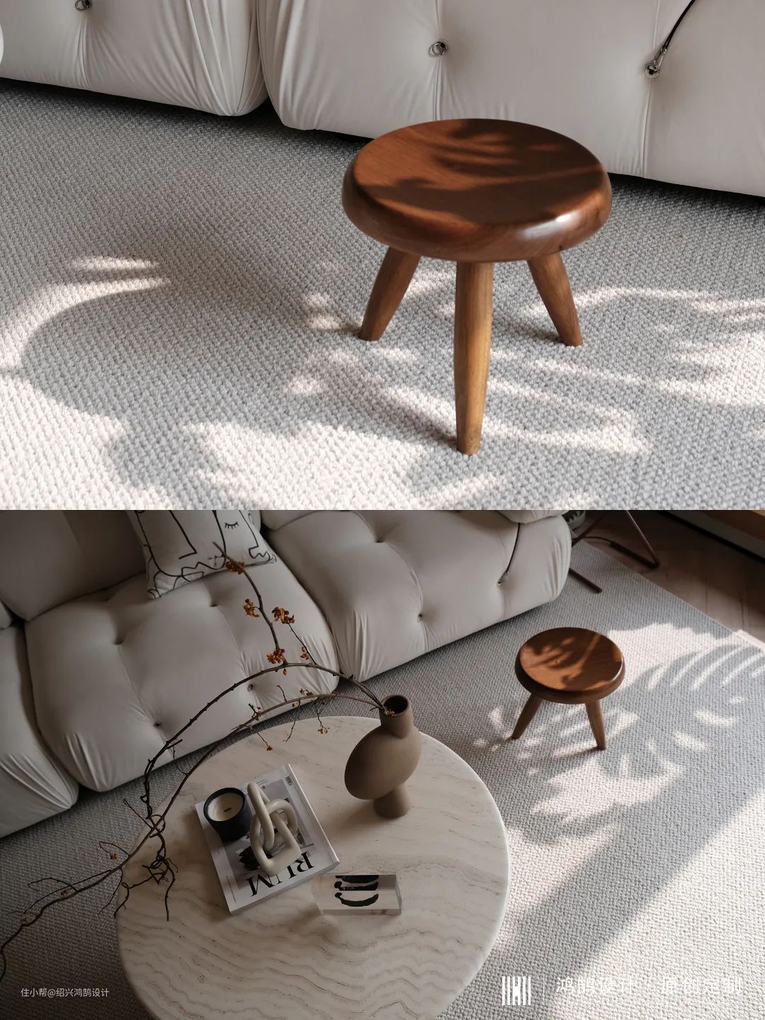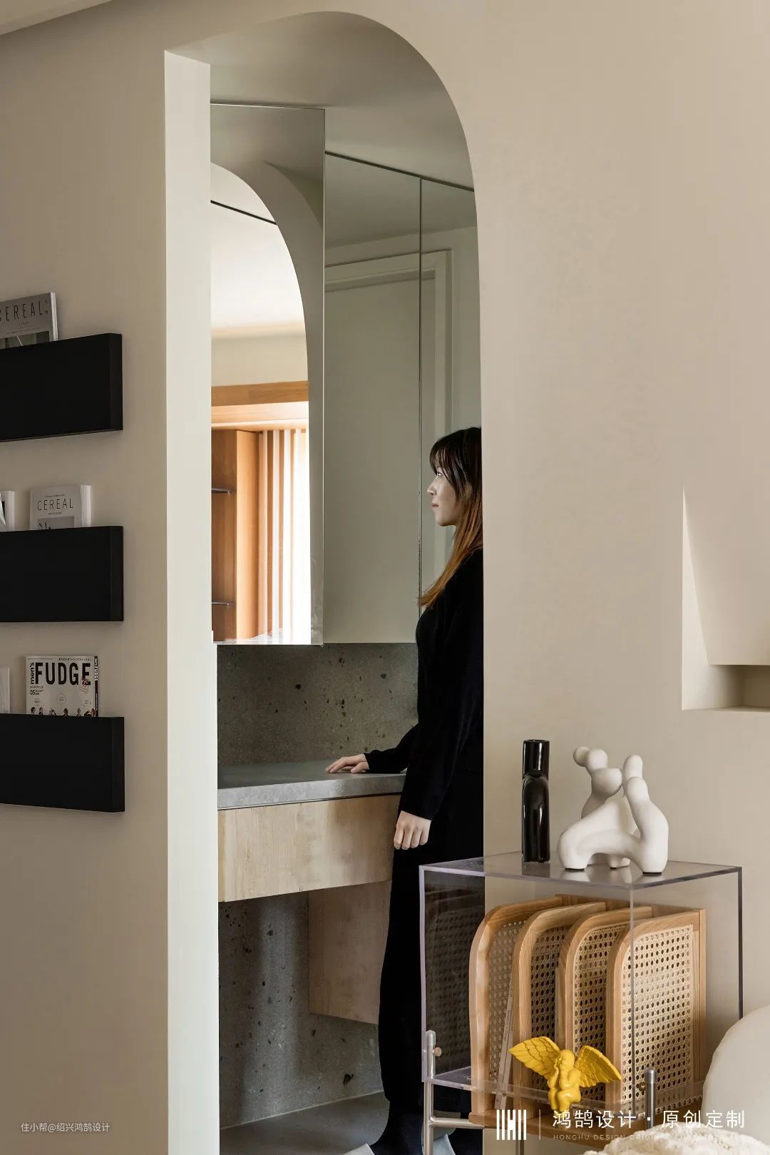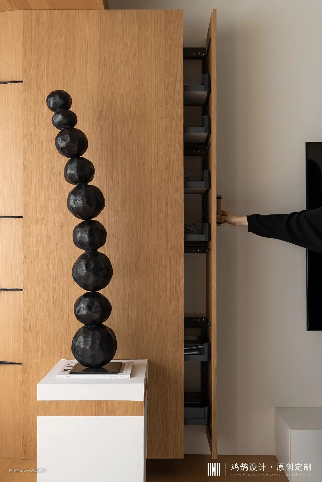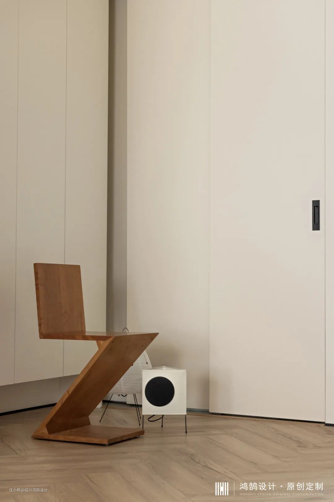 进门左侧衣柜+鞋柜组合,根据业主鞋子尺寸柜子整体悬空20cm,定制柜门板在打样阶段设计师挑选2-3款进行对比,最终选色与墙面乳胶漆接近色,达到整体环境色统一。家政间通过吊轨三移门进行开合,14.5cm超薄款移门可灵活收纳至角落,使用起来更为轻薄,视觉上也清爽简洁。
