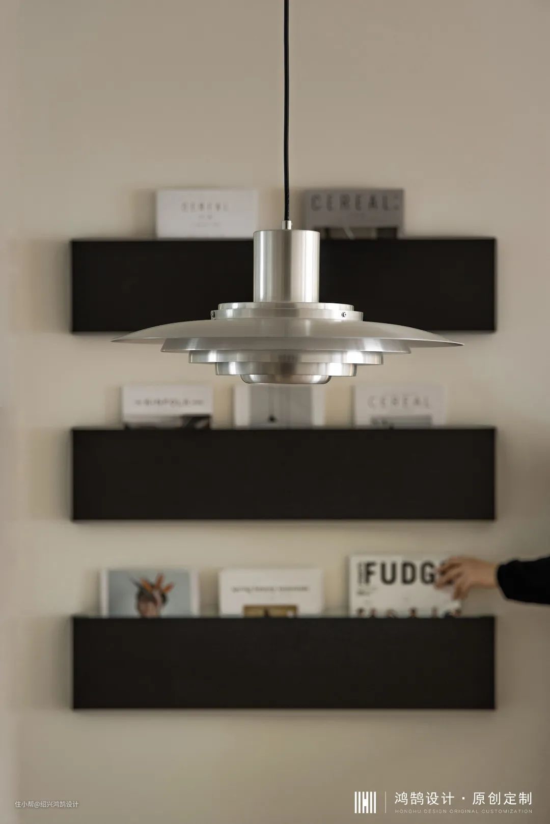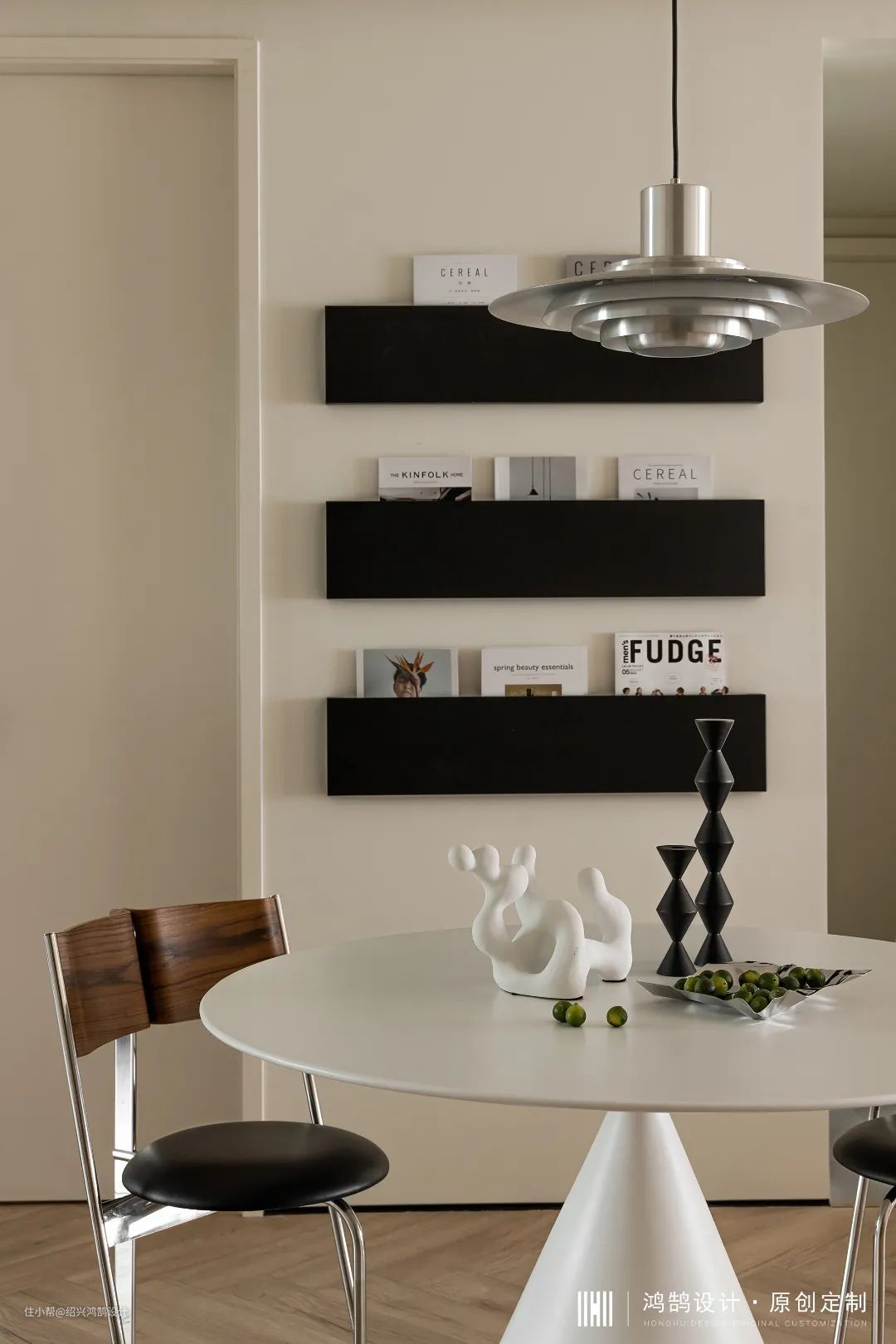 餐厅希望营造的是一家人围坐式就餐氛围,日常三人就餐,轻体量圆桌即可满足需求。几何形圆锥餐桌、飞碟灯、H椅、软装家具选品设计师独具匠心,在美观与舒适性上做到了兼顾。 墙面三层木质书架在美观与功能性上做了一些取舍,主要起到装饰与置物功能,饭后之余随手取阅书籍十分便捷。