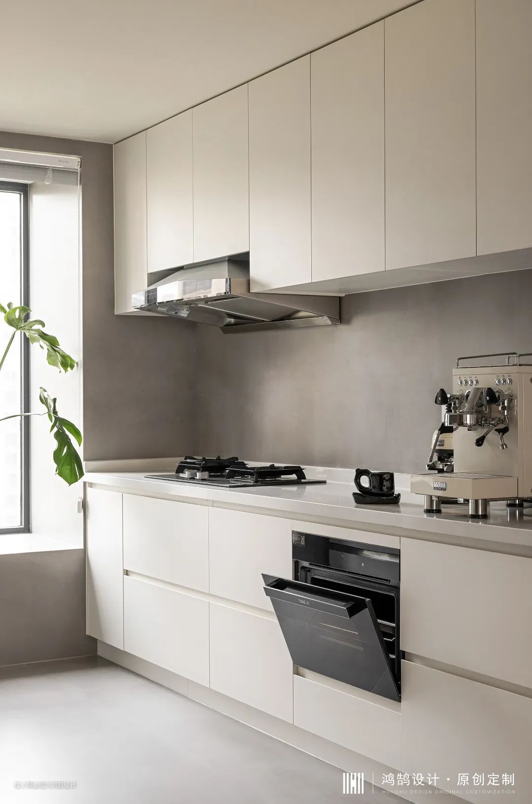 对于面点师来说,拥有一个简洁宽敞的大厨房必不可少,特别是台面置物空间,北侧窗面光线无遮挡进入室内,飘窗位置提供了更多的小型电器收纳区域,燃气灶偏左设置,右侧橱柜台面也得到了释放。灰色墙地砖一体铺设,对于厨房高频使用者来说,好打理才是好设计。