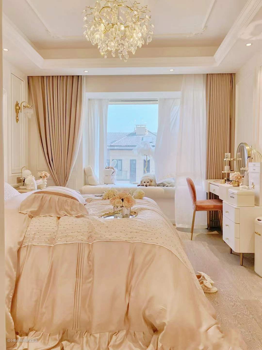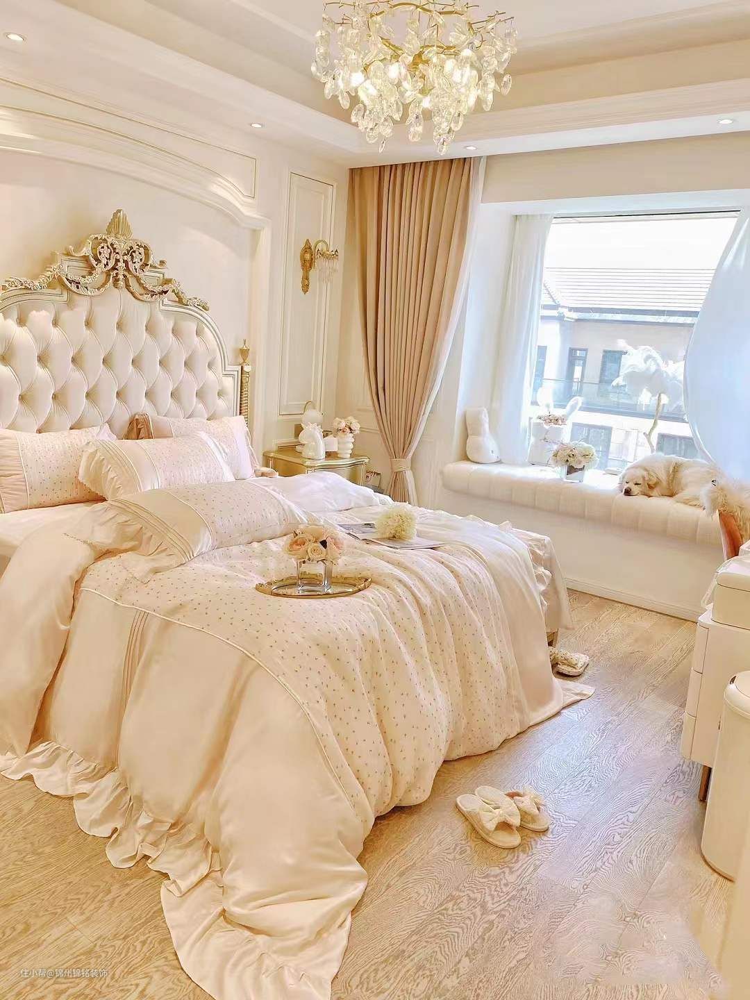 双开门宽度 ,墙面Pu线条+进 奶油色蛋壳光漆,床头背景做了护墙板定制十墙布,衣柜做在了门后,另外有衣帽间所以没有做大排衣柜,地板灰色系小板。3000k暖黄射灯十灯带,吊灯当然不能少,太好看啦!繁花水晶吊灯 法式氛围感满满,好看又好打理。床边放了金色晾衣架,好看又实用,没有太多家具装饰,但是足够好看!