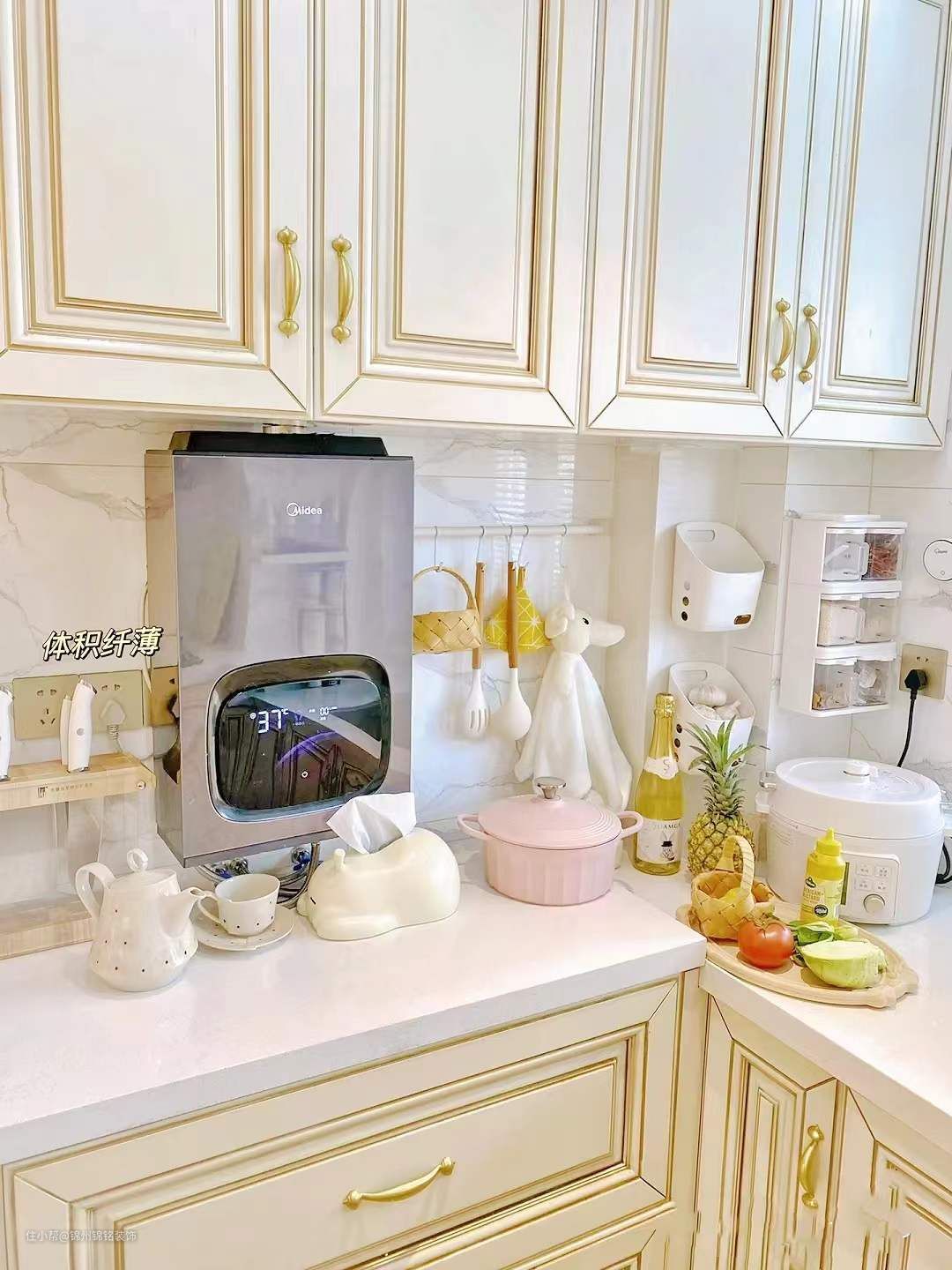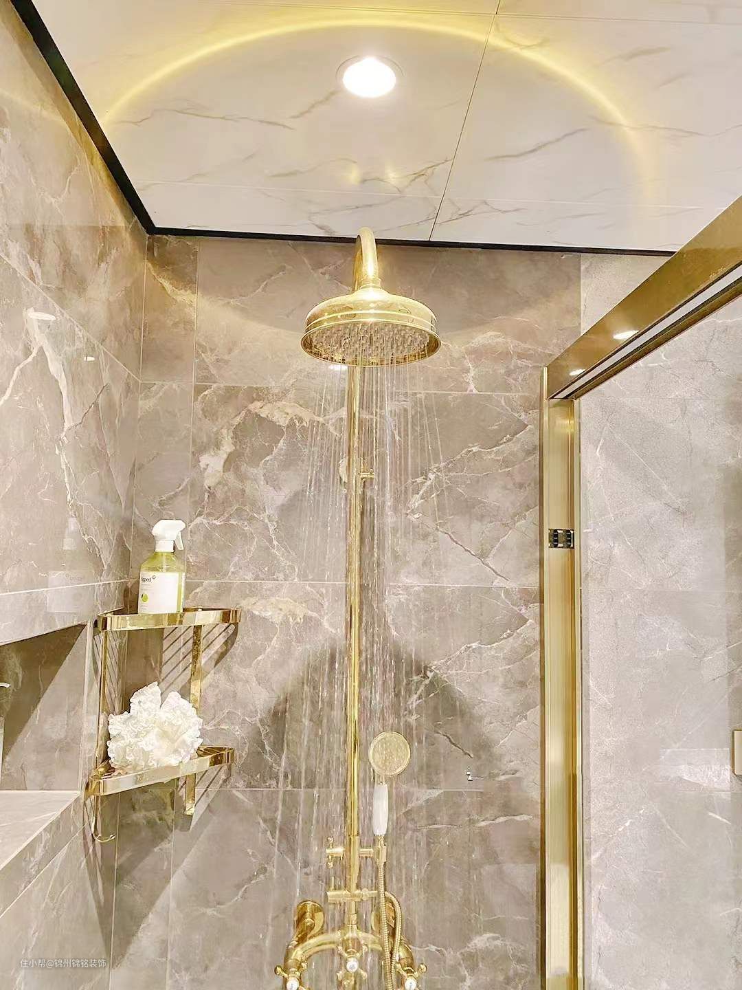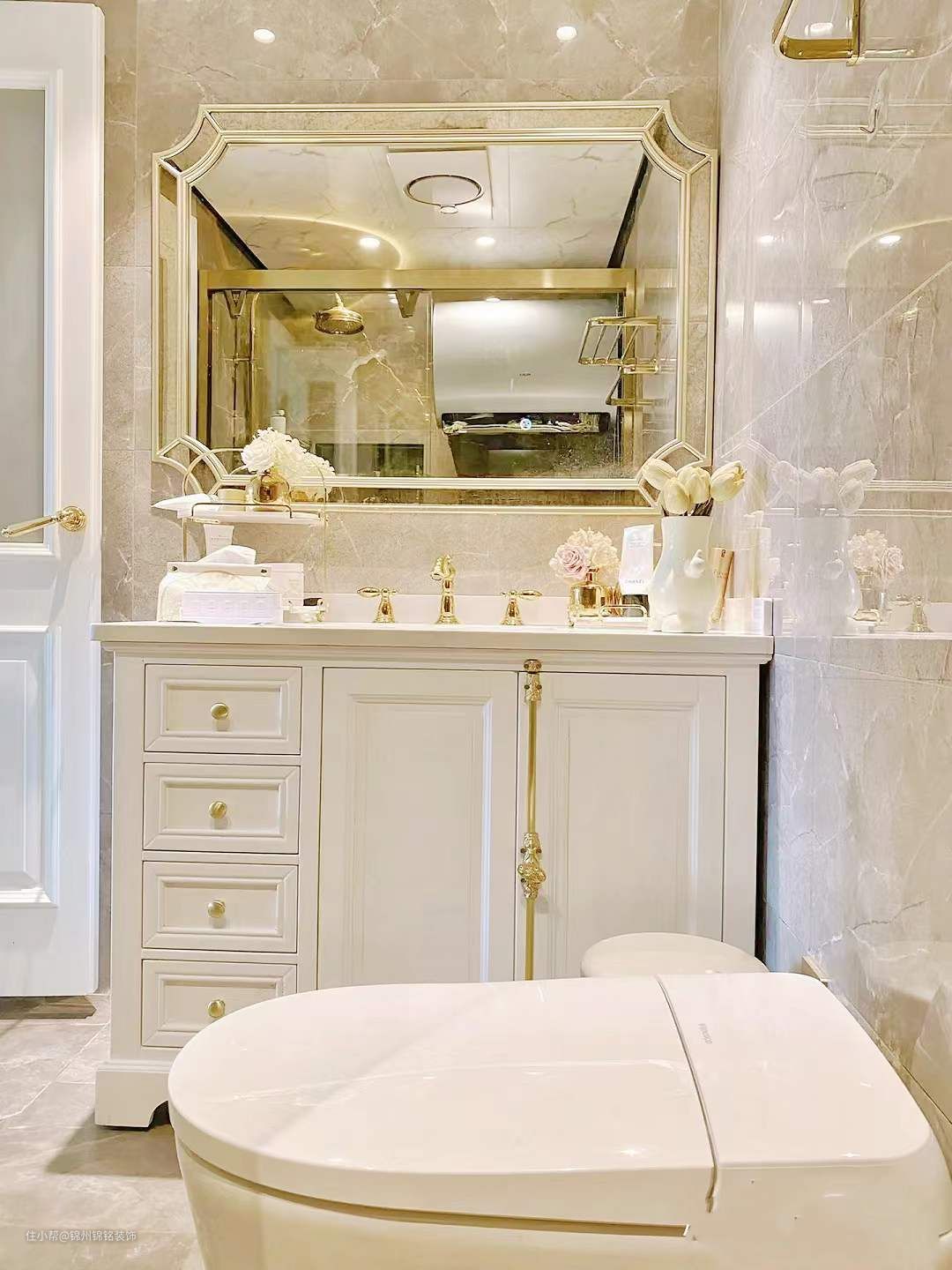 淋浴区选择了大理石地面,同样选灰色系,一定要选灰色真的并不会显暗,花洒水龙头全部选了金色,金色不生锈好打理还好看!比黑色白色都合适。花洒法式风,好看更是好用,沉沉的很有质感 !柜子这种占地面积大的一定要选浅色,白色更好,里面收纳空间很大,底下也不会留卫生死角,镜子选了这种大面积上墙的,视觉效果很好。