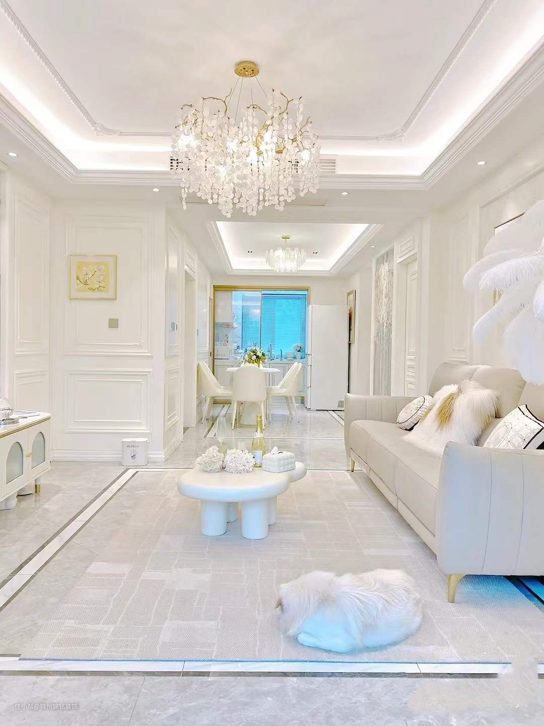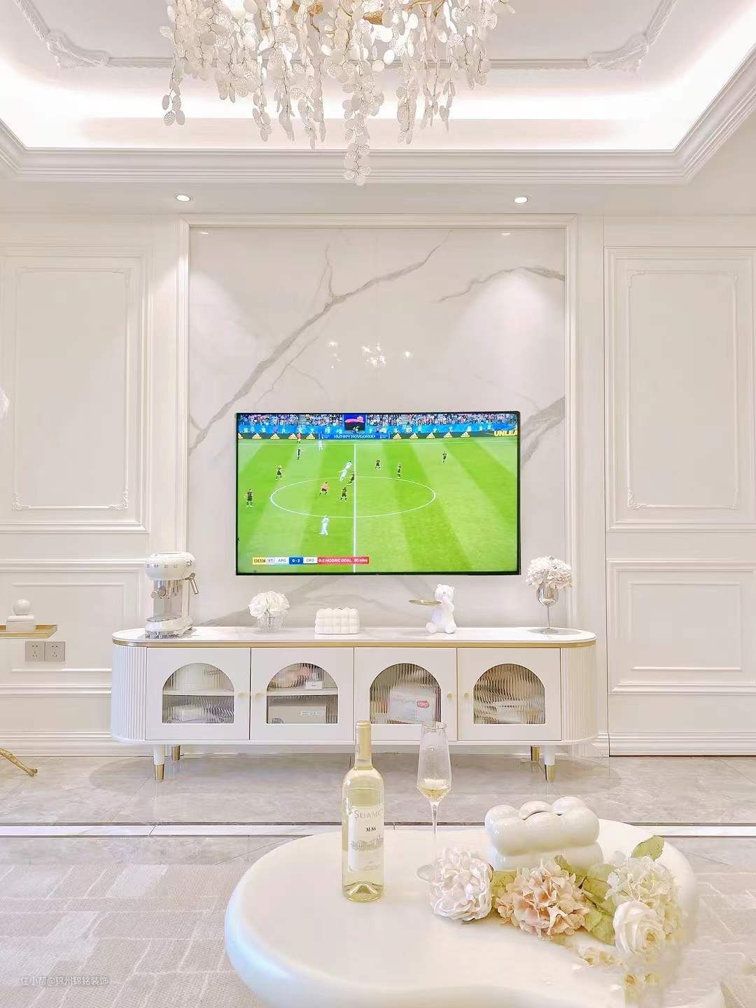 吊灯当然是 法式的灵魂,不显矮也不会难清洗, 3000K暖黄射灯,45度角,7瓦,小山丘氛围感十足,岩板+护墙板的设计,护墙板两边各宽1.2米,沙发,电视柜,地毯,茶几, 风格保持一致。