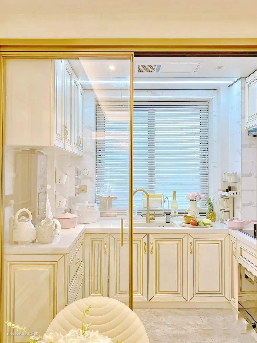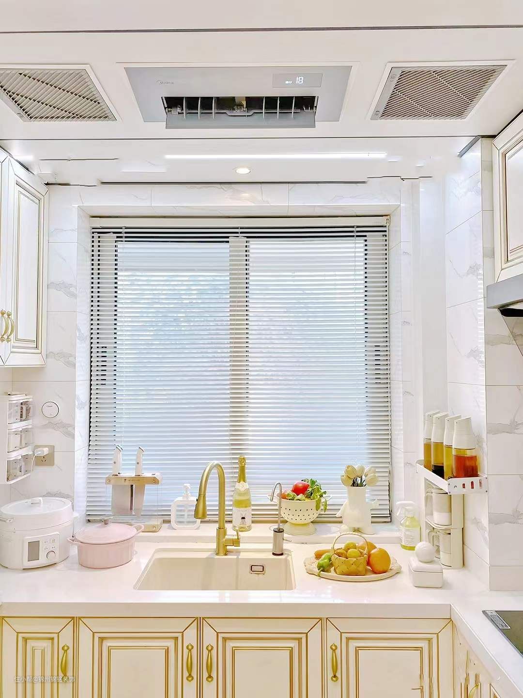 U型厨房橱柜 实木描金,墙面白色,地面灰色。铝扣板大顶+4000K灯带+两盏3000K射灯。动线是置放区一备菜区一洗菜区一切菜区一炒菜区。