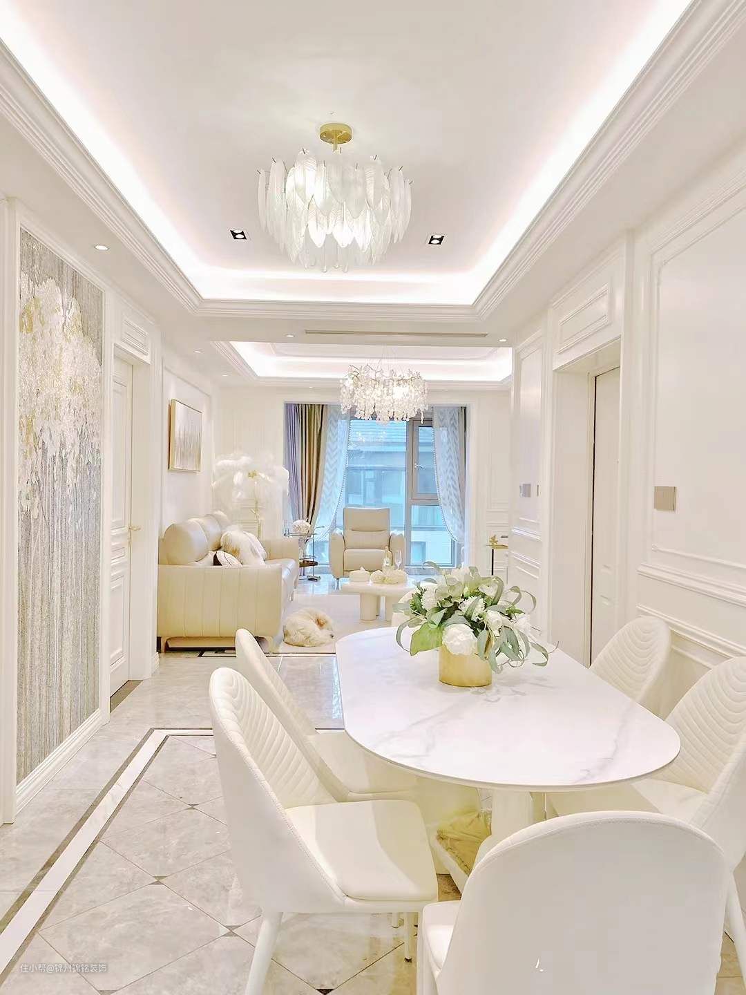 吊灯当然是 法式的灵魂,不显矮也不会难清洗, 3000K暖黄射灯,45度角,7瓦,小山丘氛围感十足,岩板+护墙板的设计,护墙板两边各宽1.2米,沙发,电视柜,地毯,茶几, 风格保持一致。