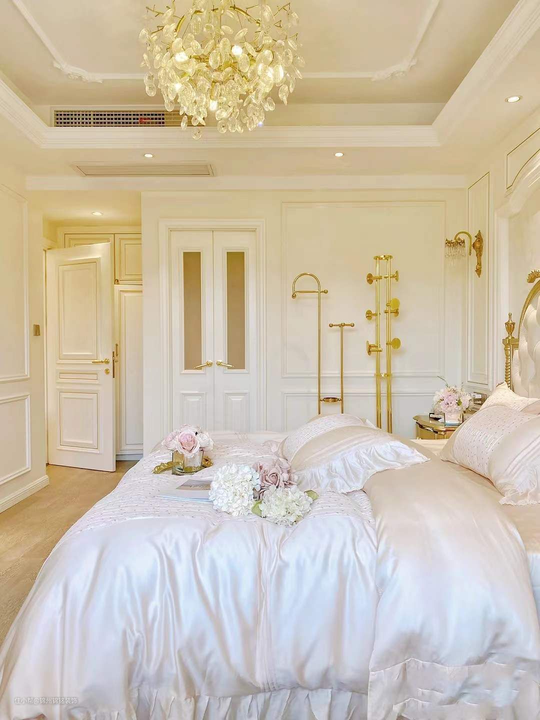 双开门宽度 ,墙面Pu线条+进 奶油色蛋壳光漆,床头背景做了护墙板定制十墙布,衣柜做在了门后,另外有衣帽间所以没有做大排衣柜,地板灰色系小板。3000k暖黄射灯十灯带,吊灯当然不能少,太好看啦!繁花水晶吊灯 法式氛围感满满,好看又好打理。床边放了金色晾衣架,好看又实用,没有太多家具装饰,但是足够好看!