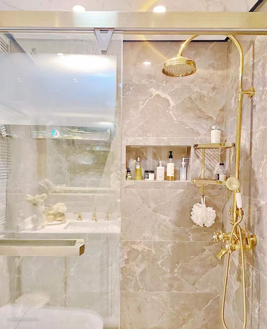 淋浴区选择了大理石地面,同样选灰色系,一定要选灰色真的并不会显暗,花洒水龙头全部选了金色,金色不生锈好打理还好看!比黑色白色都合适。花洒法式风,好看更是好用,沉沉的很有质感 !柜子这种占地面积大的一定要选浅色,白色更好,里面收纳空间很大,底下也不会留卫生死角,镜子选了这种大面积上墙的,视觉效果很好。