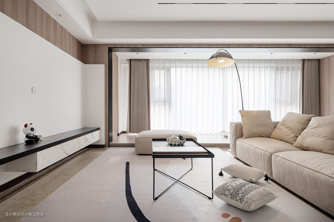 除了硬装上“留白”软装上也是温馨满满,沙发选择米色的科技布沙发,这种布料通气性好,外观、纹理、色泽都接近真皮,并且还有很强的亲肤性,坐在上面就像是在云朵上。 茶几是非常方正的造型,但是看起来一点都不显得粗犷,桌面是托盘的样式,里面嵌入了一小块木板做茶托,旁边可以放一些果盘之类的,桌腿是两根铁架交错组成,稳固性好还美观。 地毯购入大尺寸,从阳台一直铺到客厅的边缘处,浅粉色和白色拼接做底色,黑色线条做装饰,简单又显品质格调,为了区分阳台还在阳台下搭建了地台抬高地面。