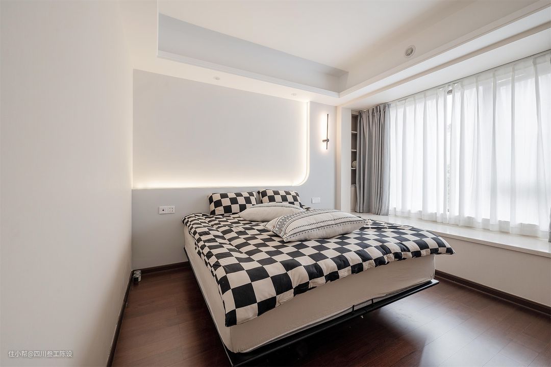 主卧的颜色只有三个,黑、白、棕。双层吊顶和无主灯设计使空间的空旷感更强,哪怕有阳光感觉也空洞的,再加上墙面全是白色乳胶漆,搭配严谨、百搭的黑白色方格被套,空间显得有些冷清。 还在设计师别出心裁将床头的背景墙划分成了两层,看起来像是一个圆角矩形,里面埋上灯带,打开灯后空间摇身一变,层次感和科技感都有了,并且大面积的白色也不会显得空荡。 空间“化繁为简”,连床头柜都没有安装,只保留了几个插座,方便手机充电。怕光照不够也为了线条的补充,墙上还安装了一根线型灯,内射灯光科技感更强。 飘窗的窗户是比较大的,还算在床上也可以将窗外景色一览无余,窗户边缘处安装了一面陈列柜,方便储物收纳,因为有窗帘的遮挡,这个空间并不显眼。