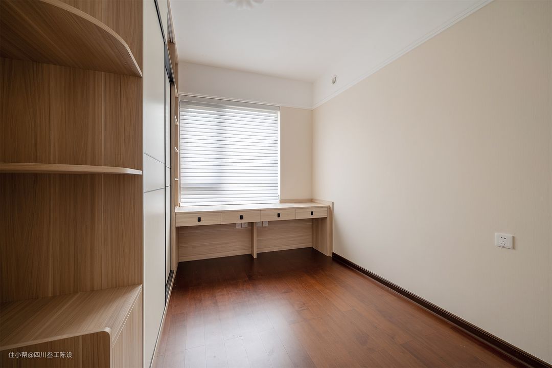 书房定做的是一个一体化书桌,四个抽屉适合放本子、合同和一些杂物。桌子就朝着窗口,采光好不容易伤眼,旁边是一排架子,放置书本是非常适合的,朝门走,一个推拉的衣柜,陈列的钻石柜。