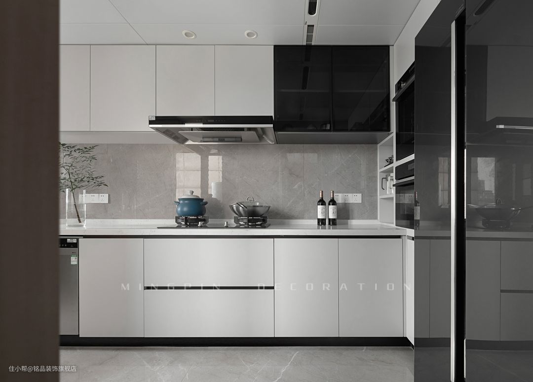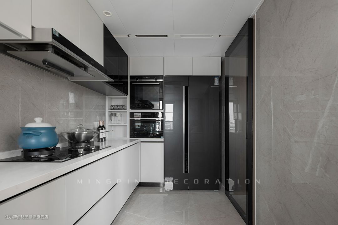 厨房空间呈条形状,墙面定制了充足的柜体,满足后期厨房的一切收纳需求。一字型操作台面也让下厨的取-洗-切-炒-盛动线可以一气呵成
