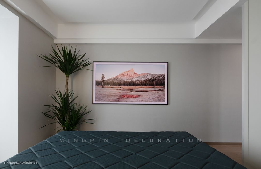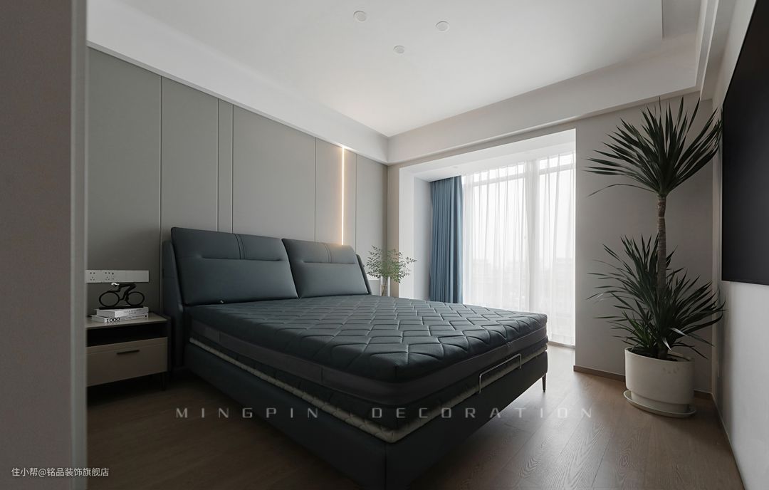 主卧室相对客厅来说,显得格外细腻与静谧,高级灰的乳胶漆搭配原木地板,勾勒出空间的自然温润气质。不仅在视觉中呈现了一定的大气感,也很巧妙的提升了空间的温度感