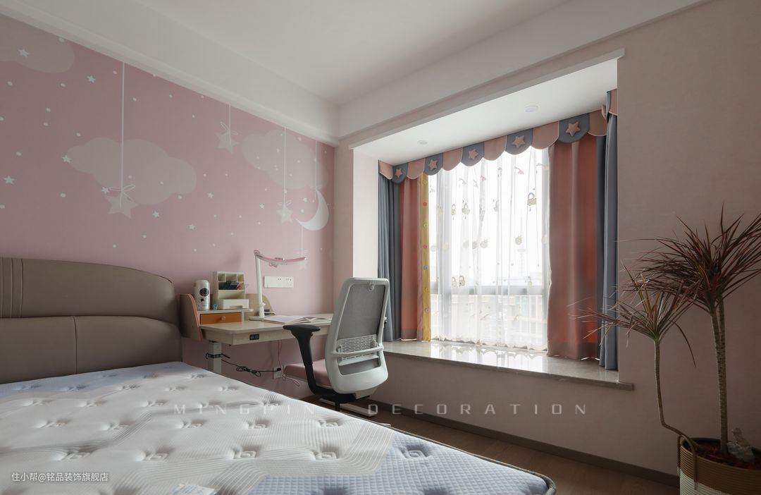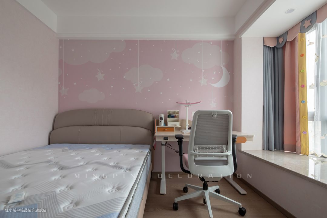 女孩房设计非常的粉嫩,符合小女生的喜好和审美。粉棕配色让睡眠空间多了一抹艺术韵味