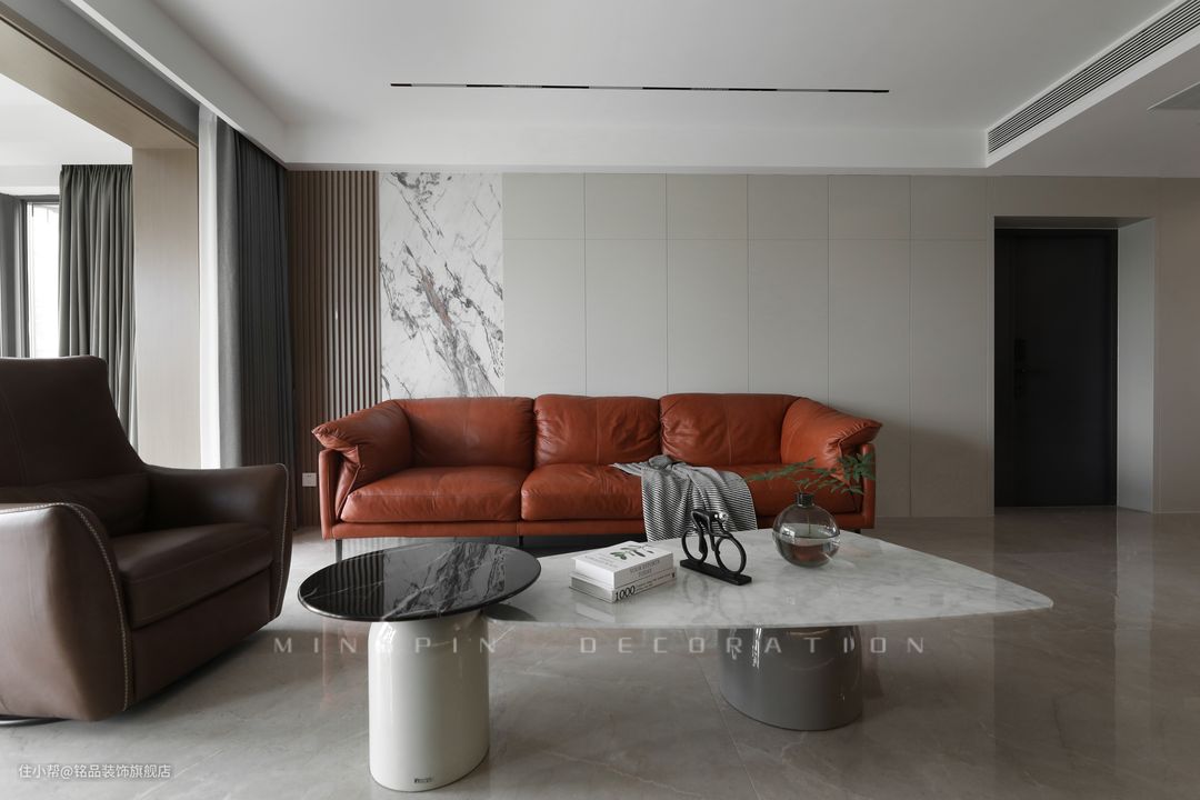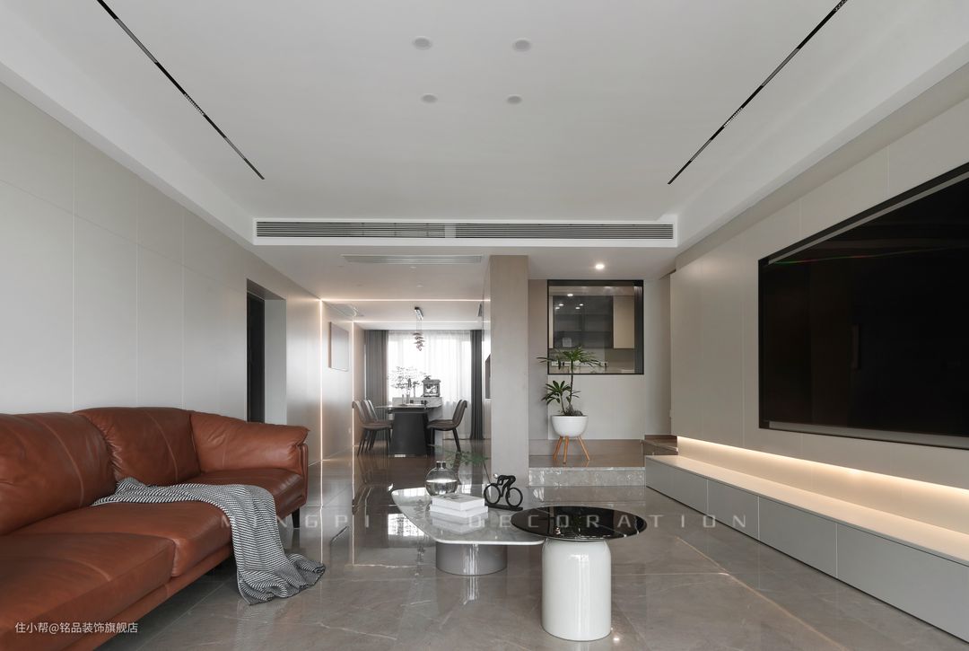 客厅利用无主灯设计+两侧磁吸轨道灯照明,光线充足又不会压低层高。平面式吊顶也是时下很流行的设计理念,经典耐看,半悬浮电视背景墙的设计也是妥妥的烘托出了空间感,让小小的会客厅宛如居家艺术空间一般