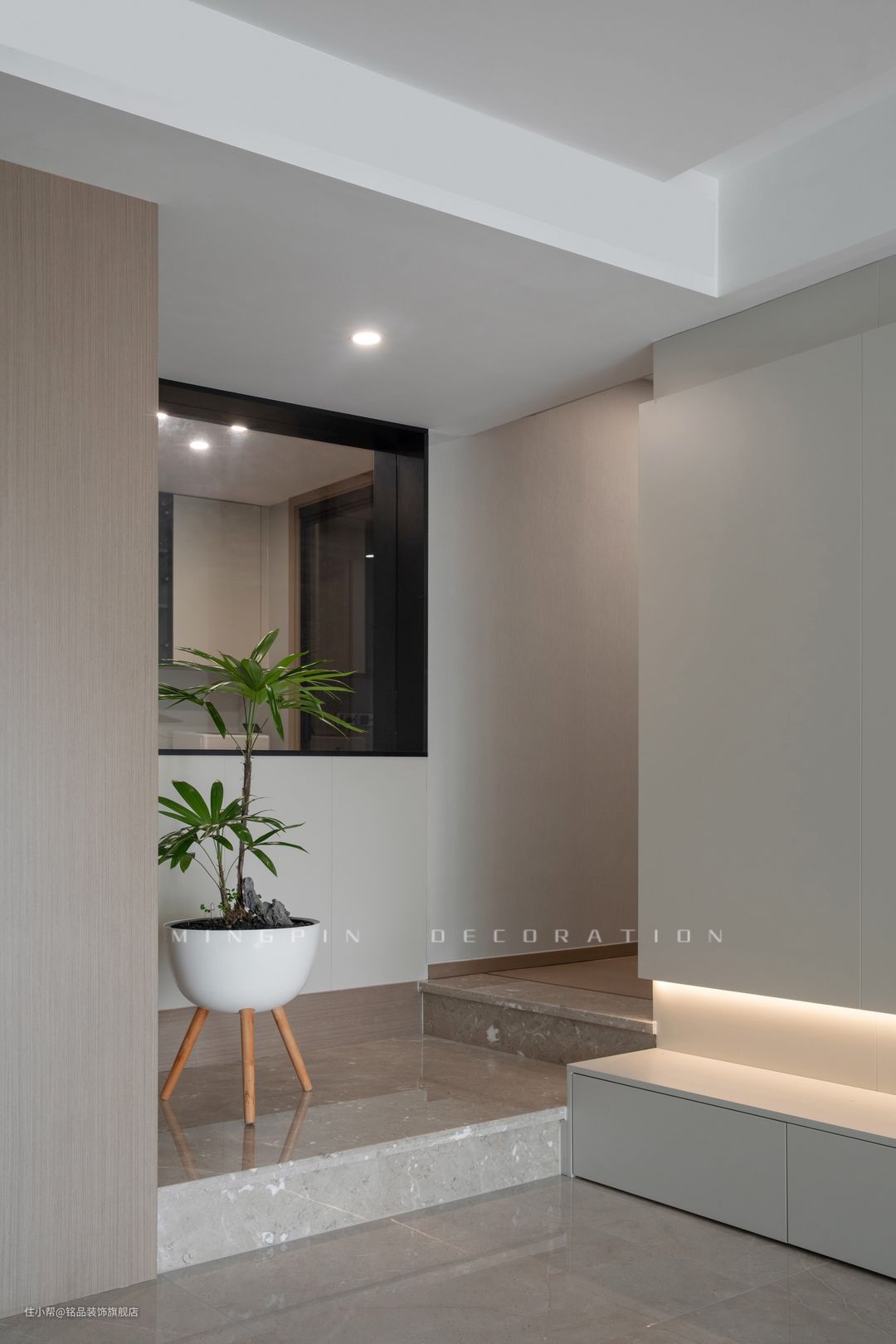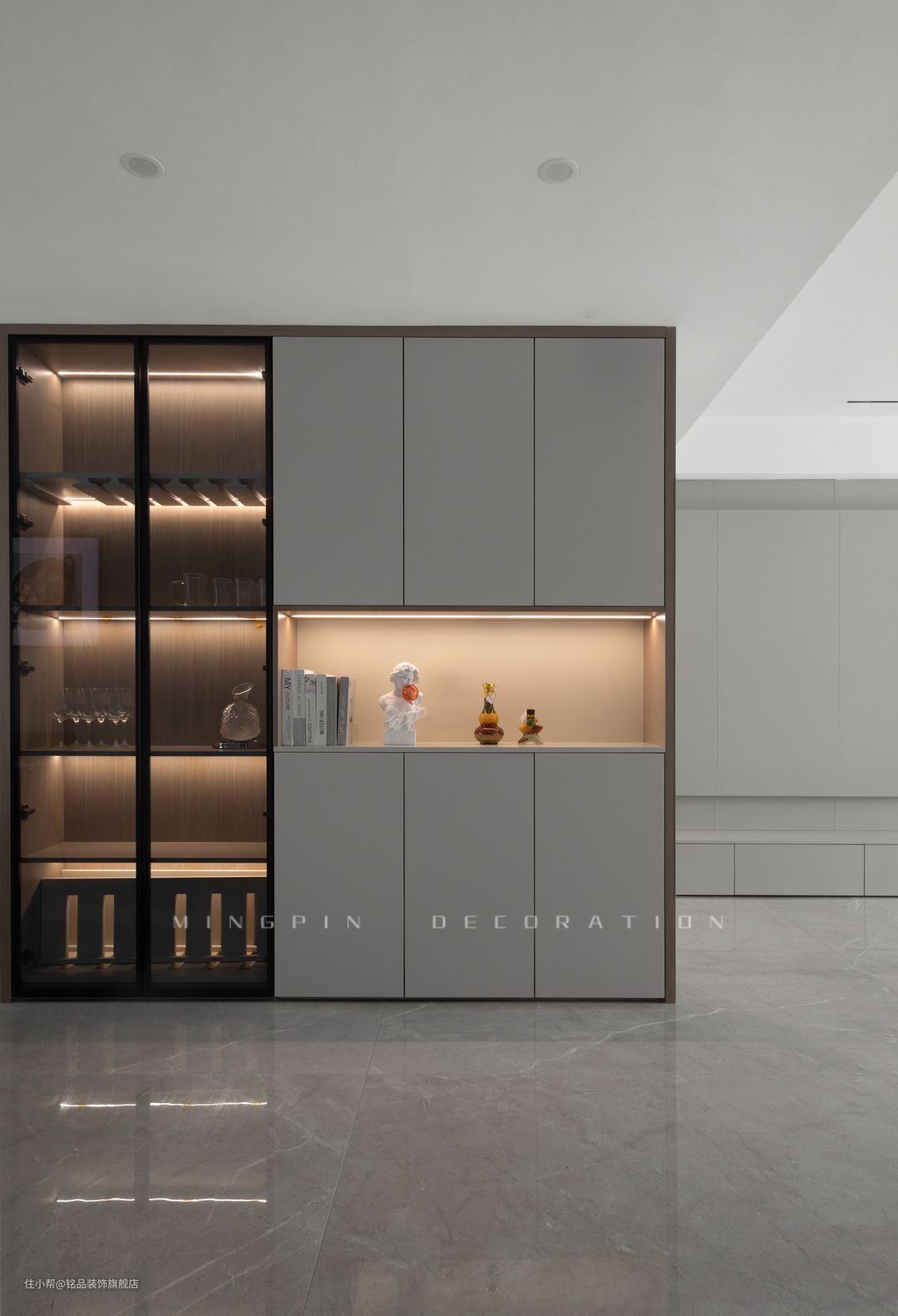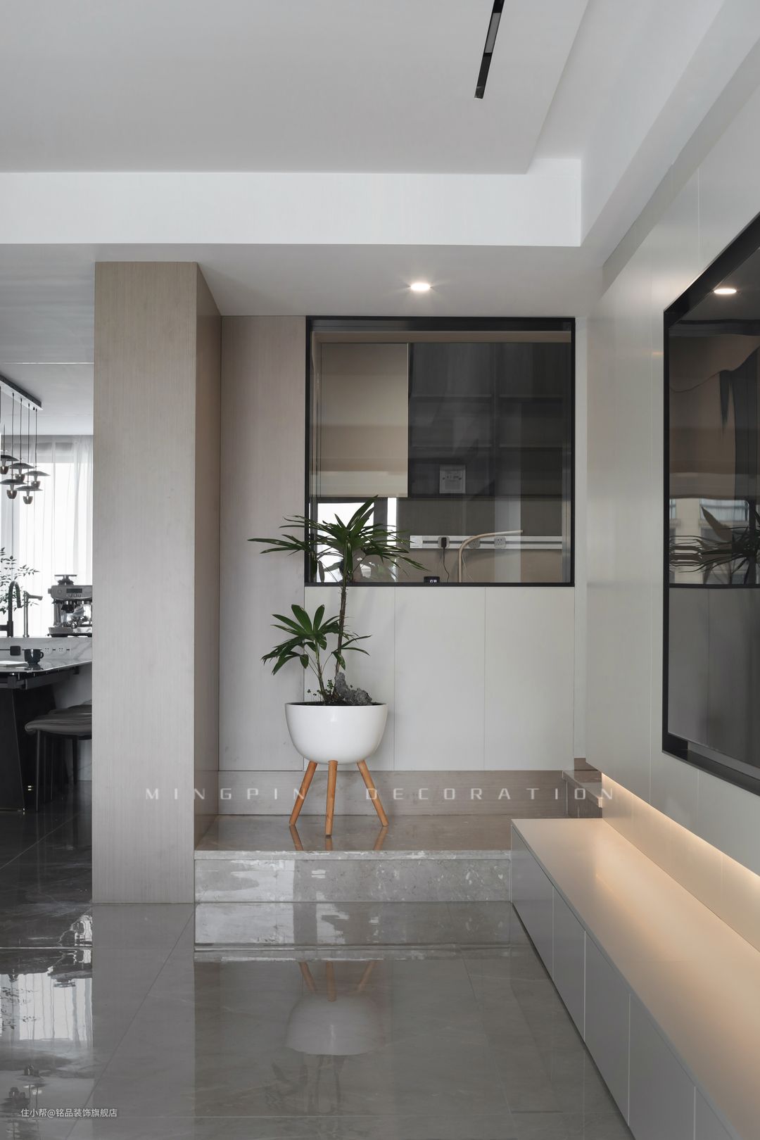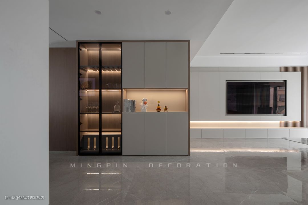 入户区域正面直对的是白墙,所以改造成通顶收纳柜,即美化了空间又能够很好的解决入户收纳问题。利用灯带、玻璃等装饰元素,营造出一份高级美感的入户视角