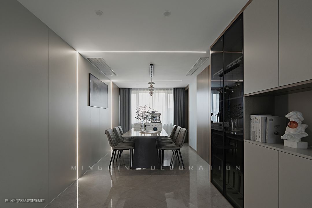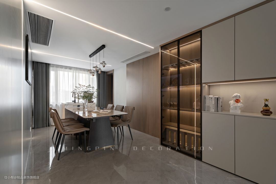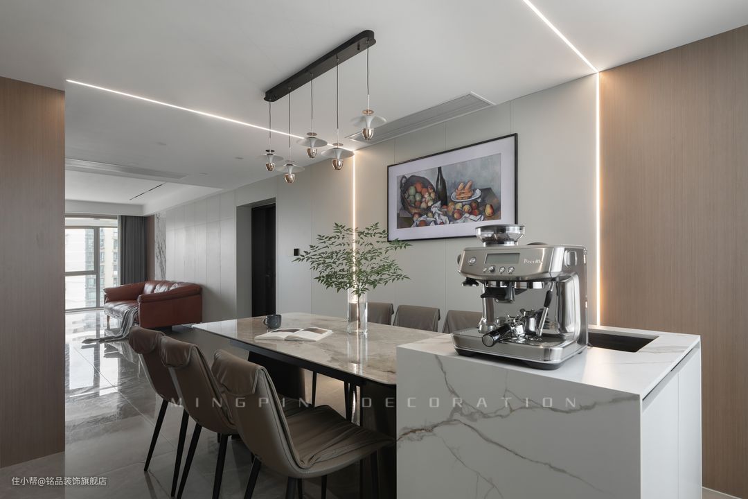 就餐区以餐桌+岛台一体的结构,吊顶+线性装饰灯光组合照明下,让屋主的一日三餐变得特别有仪式感
