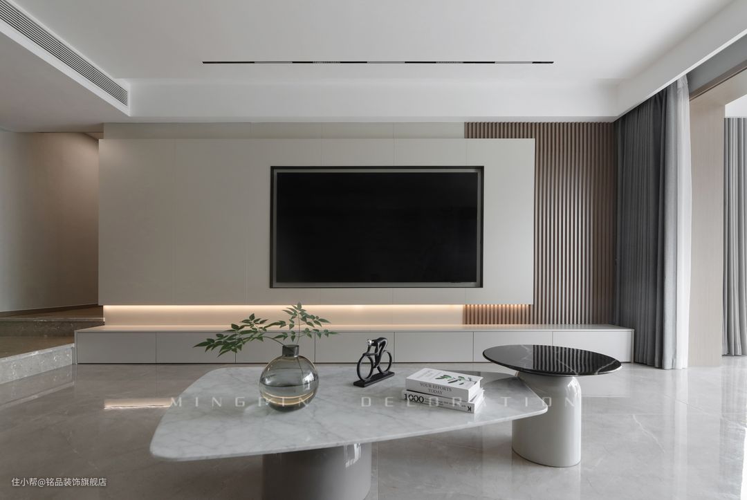 客厅的电视背景墙应该说是全案的设计亮点,这里设计了“暗道”可以通往其它空间。台阶式的转折区域让空间的层次感更足,给人带来一种满分高级感的私宅效果