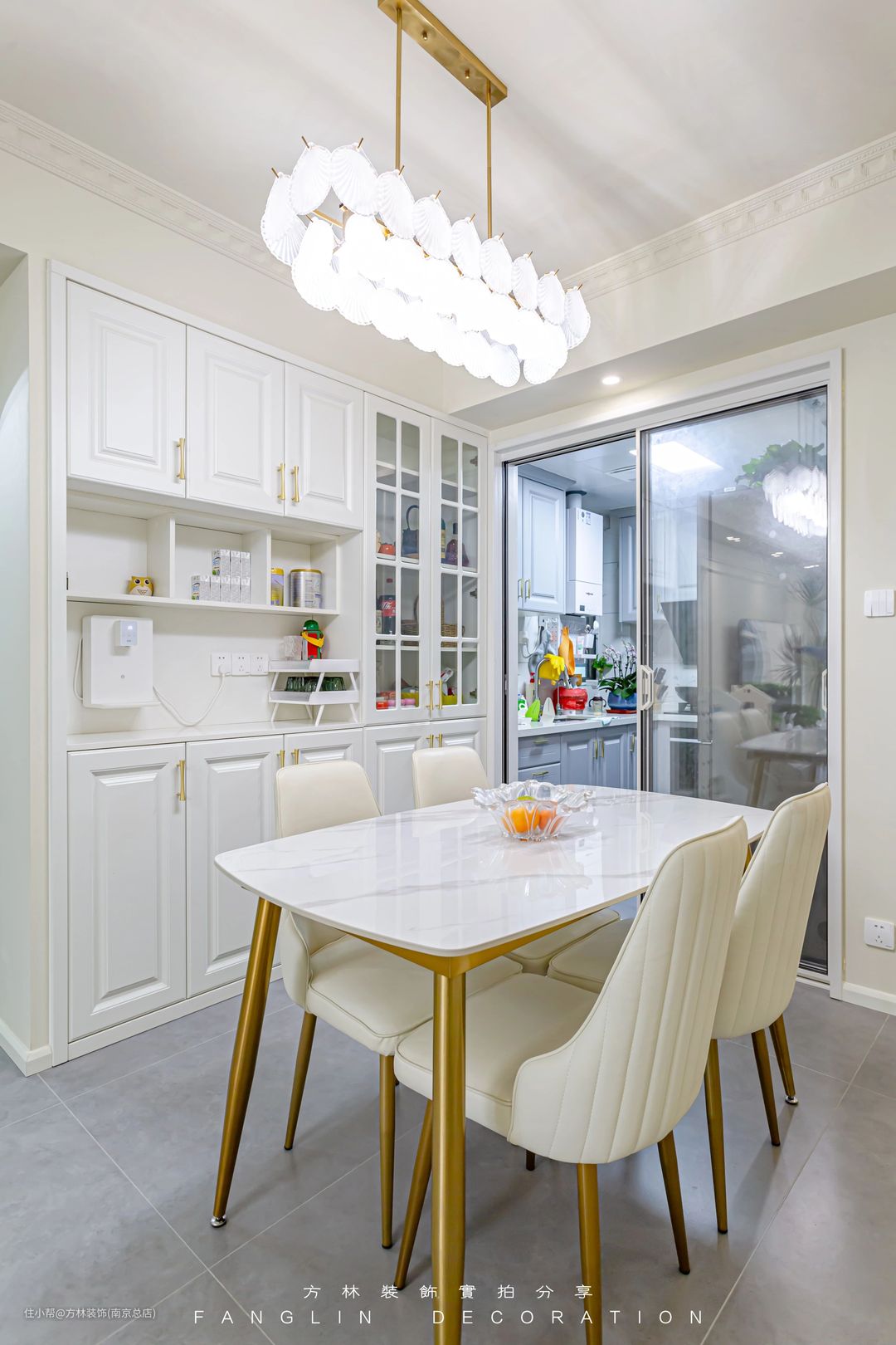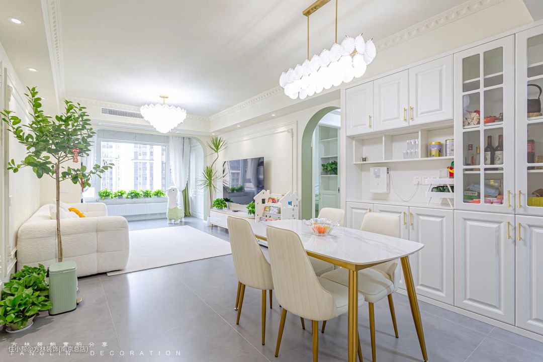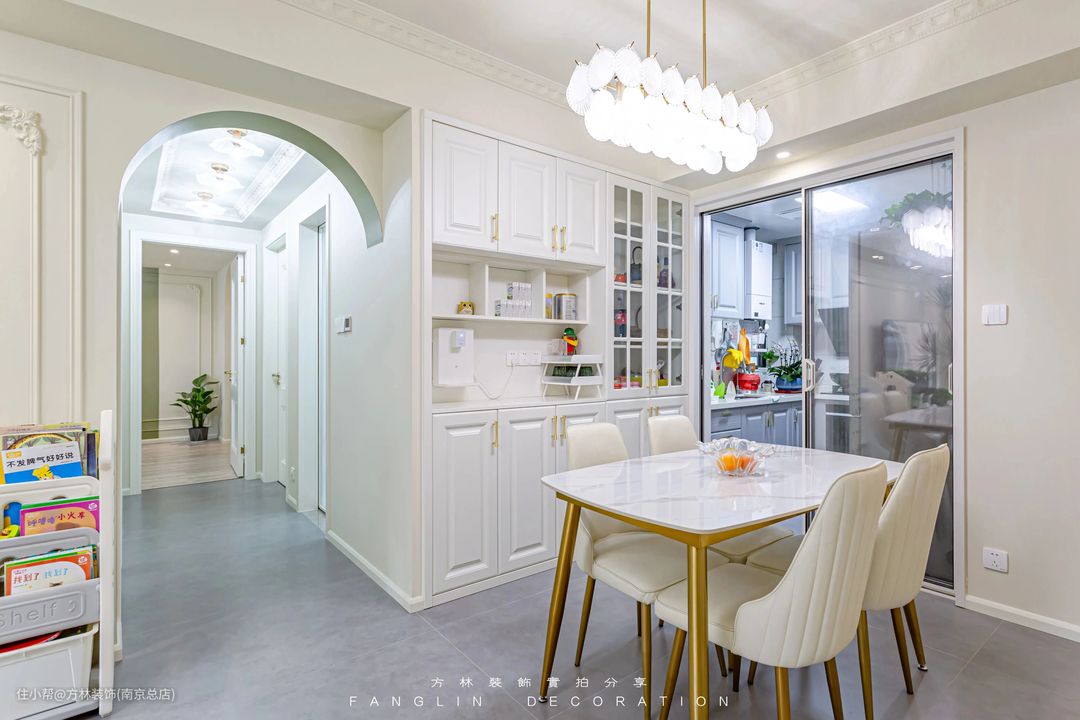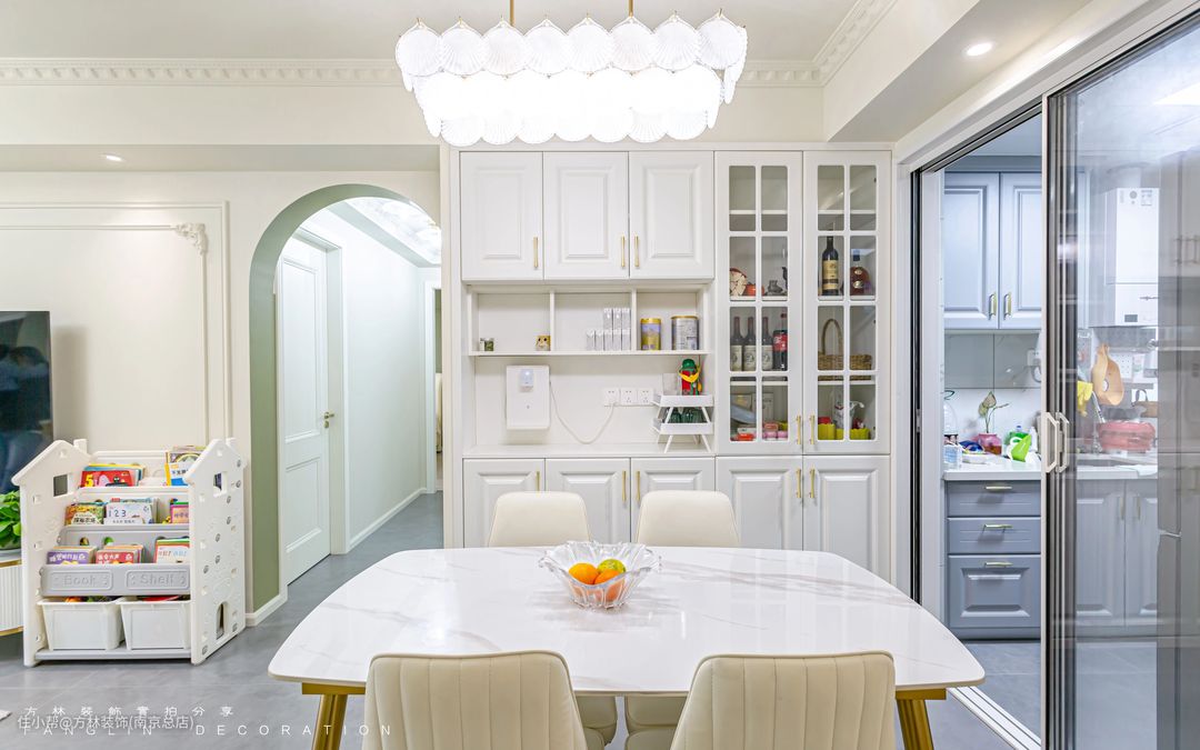 餐厅白金配色的餐桌与空间整体的搭配更加的协调,白色的餐边柜可以满足收纳的功能,旁边设计师做了定制的通顶柜,完全可以满足客户的日常需求,白色的排灯可以用来区分空间功能的不同。餐厅中奶油色的明暗对比、材质与肌理间的碰撞融合,打造出层次丰富的艺术感,大胆且直观的营造舒缓和优美,将法式的浪漫绽放到极致。