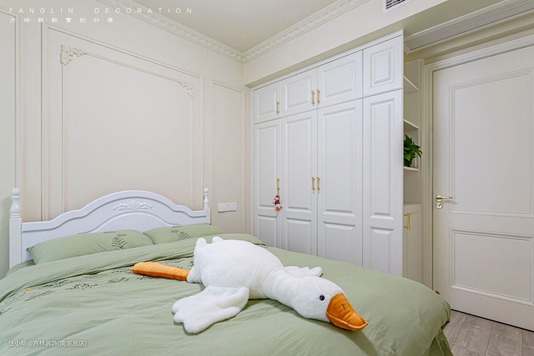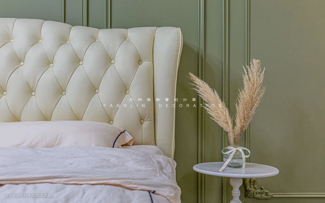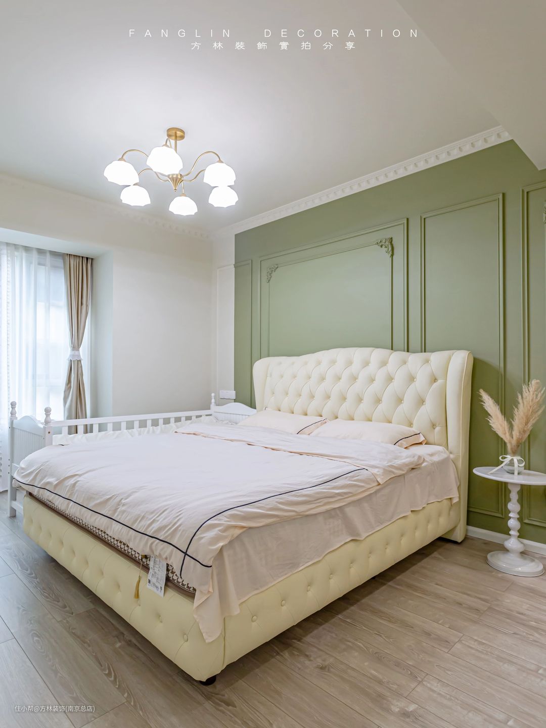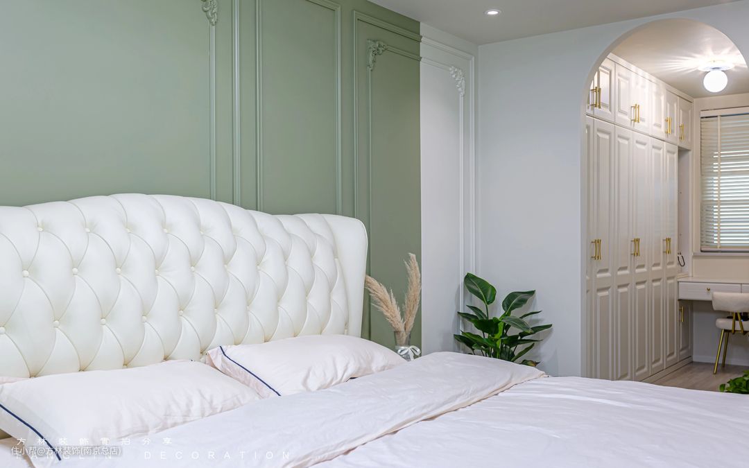 主运用大面积的绿色来让整个空间都更加灵活起来,米白色的床搭配绿色的背景墙让卧室的空间更加的清新舒适,大窗的设计可以让室内的阳光更加的充足,设计师还在主卧给女主人做了衣帽间,法式拱门的设计让整个空间更加精致。