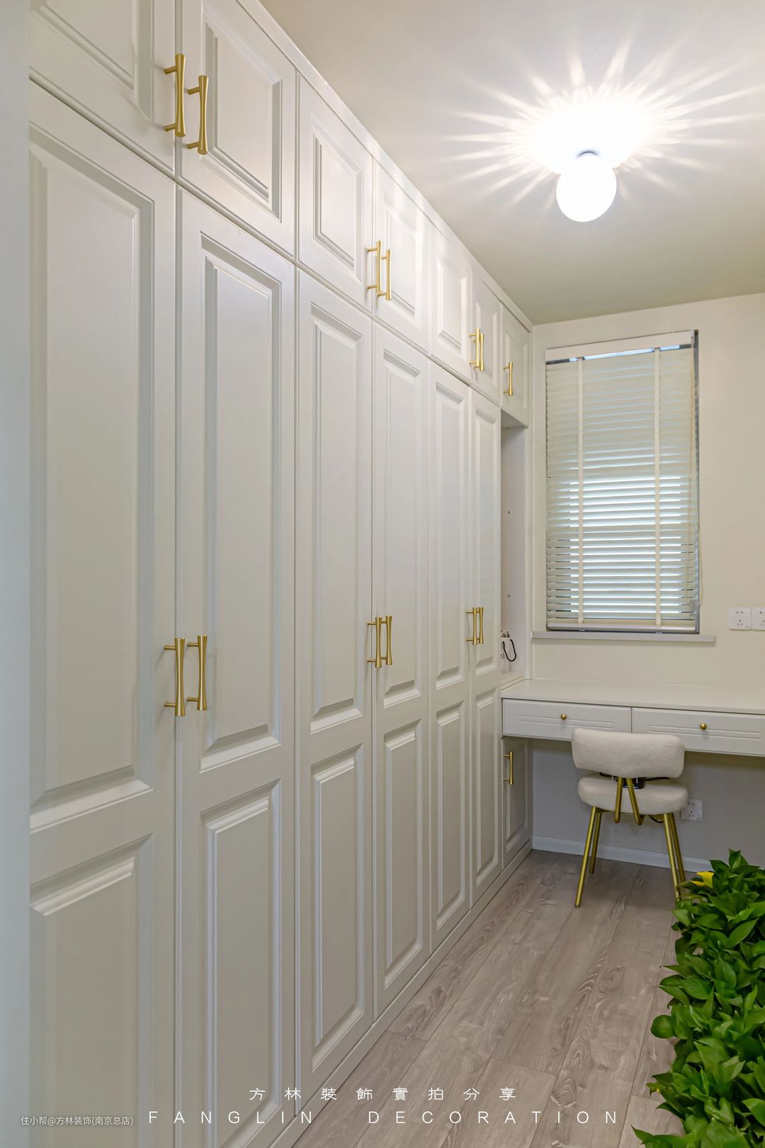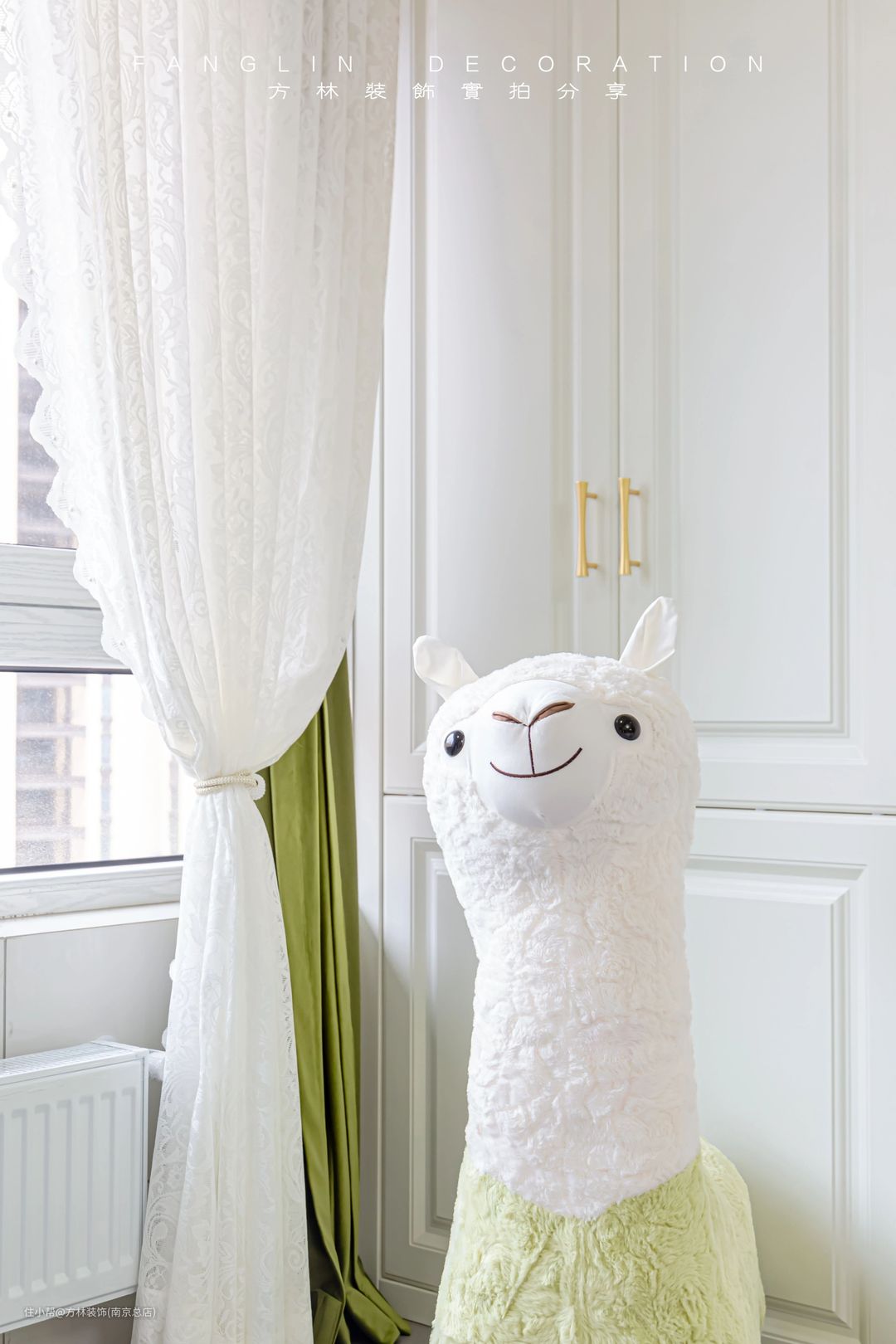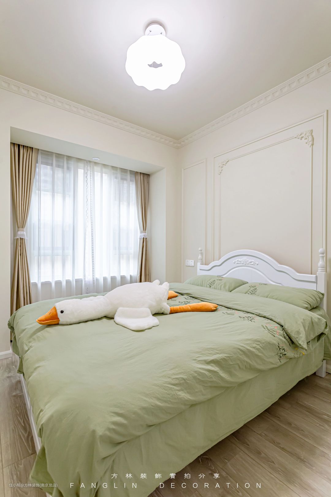 主运用大面积的绿色来让整个空间都更加灵活起来,米白色的床搭配绿色的背景墙让卧室的空间更加的清新舒适,大窗的设计可以让室内的阳光更加的充足,设计师还在主卧给女主人做了衣帽间,法式拱门的设计让整个空间更加精致。