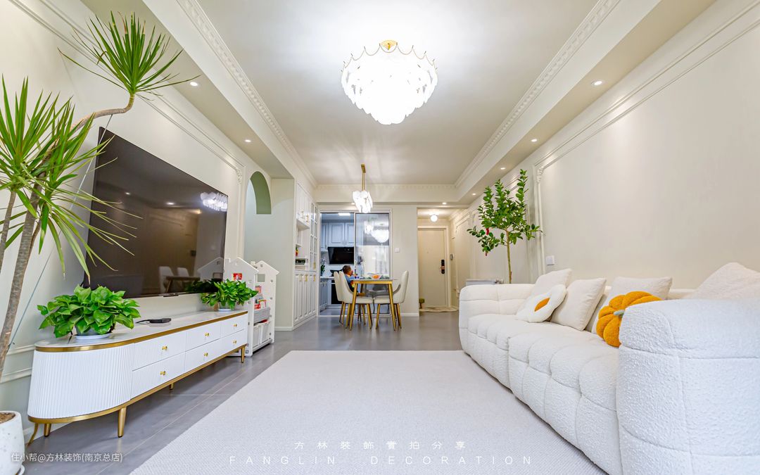 客厅区域的法式石膏线条,墙面PU线条雕花和乳胶漆茬色点缀;化繁为简,保留法式的优雅风格,用简单的线条刻画出浪漫气息,背景墙是设计师特调的奶杏色,搭配白色的沙发然整个空间的色调更加的柔和,再搭配上绿色植物,空间更加充满生机与活力。