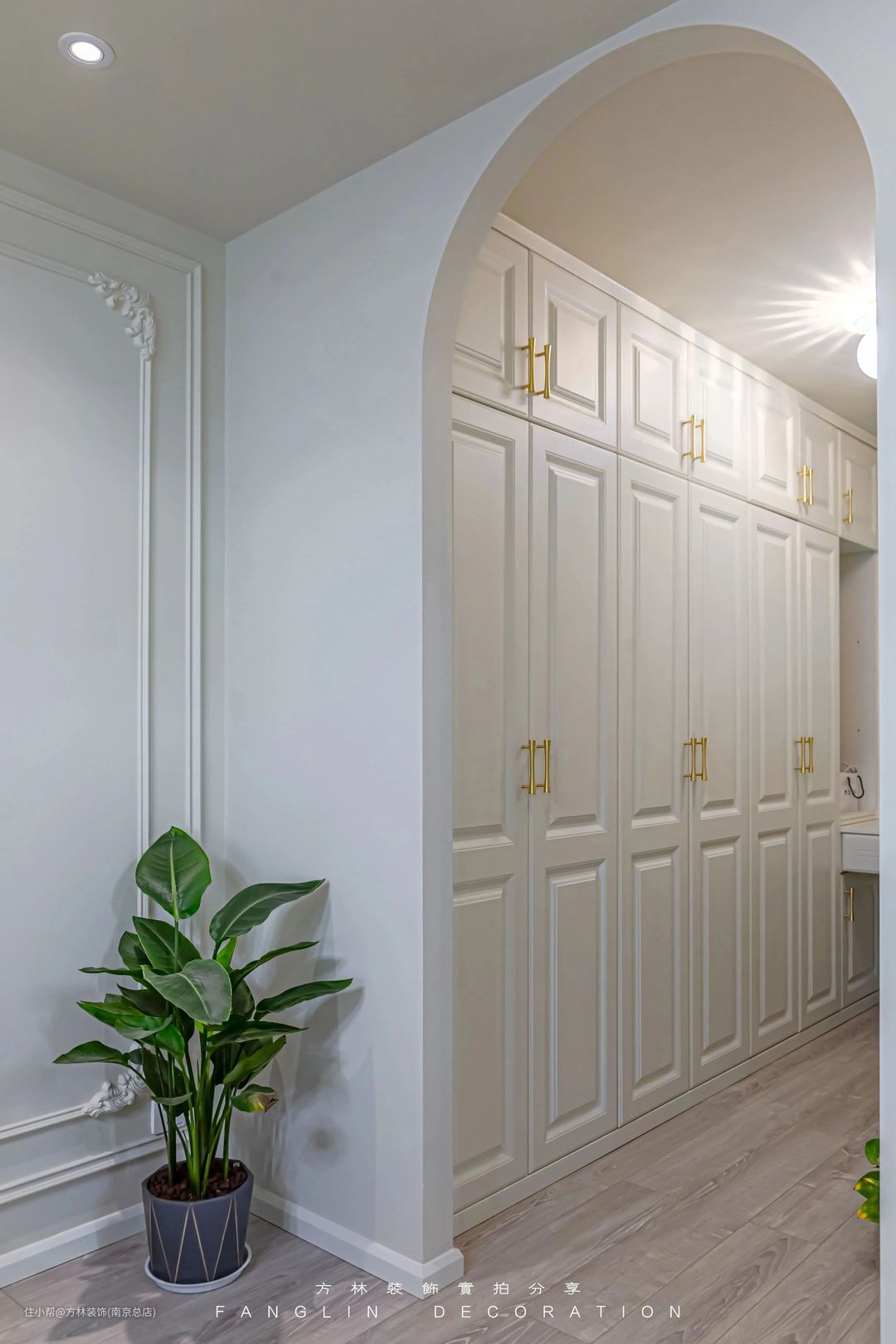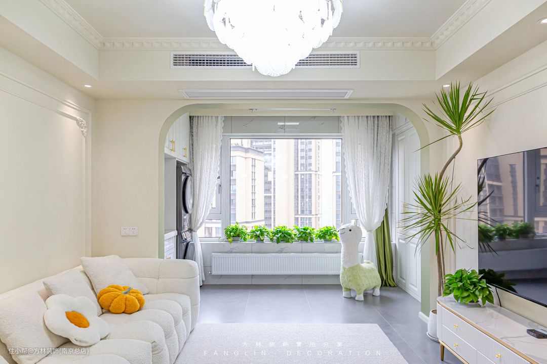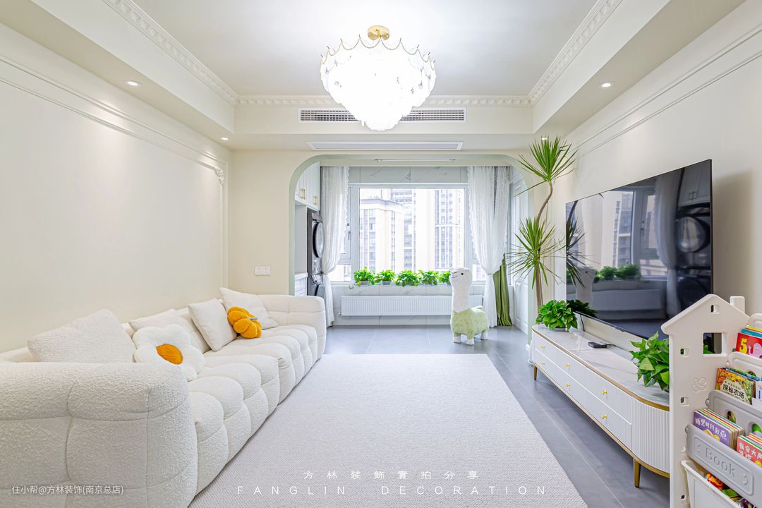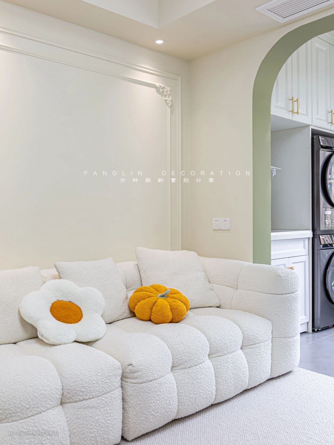 本案是115㎡的两居室,房主是一对新婚的小夫妻,这套房子呢也是小夫妻的婚房,女主人希望装修后整个空间的氛围是清新自然的,喜欢时下最流行的奶油风和法式风,想让客厅的空间可以更加的通透宽敞一些,于是设计师把阳台与客厅打通,阳台做成了洗衣的区域,可以节约卫生间的空间,整体风格做了轻法奶油风。