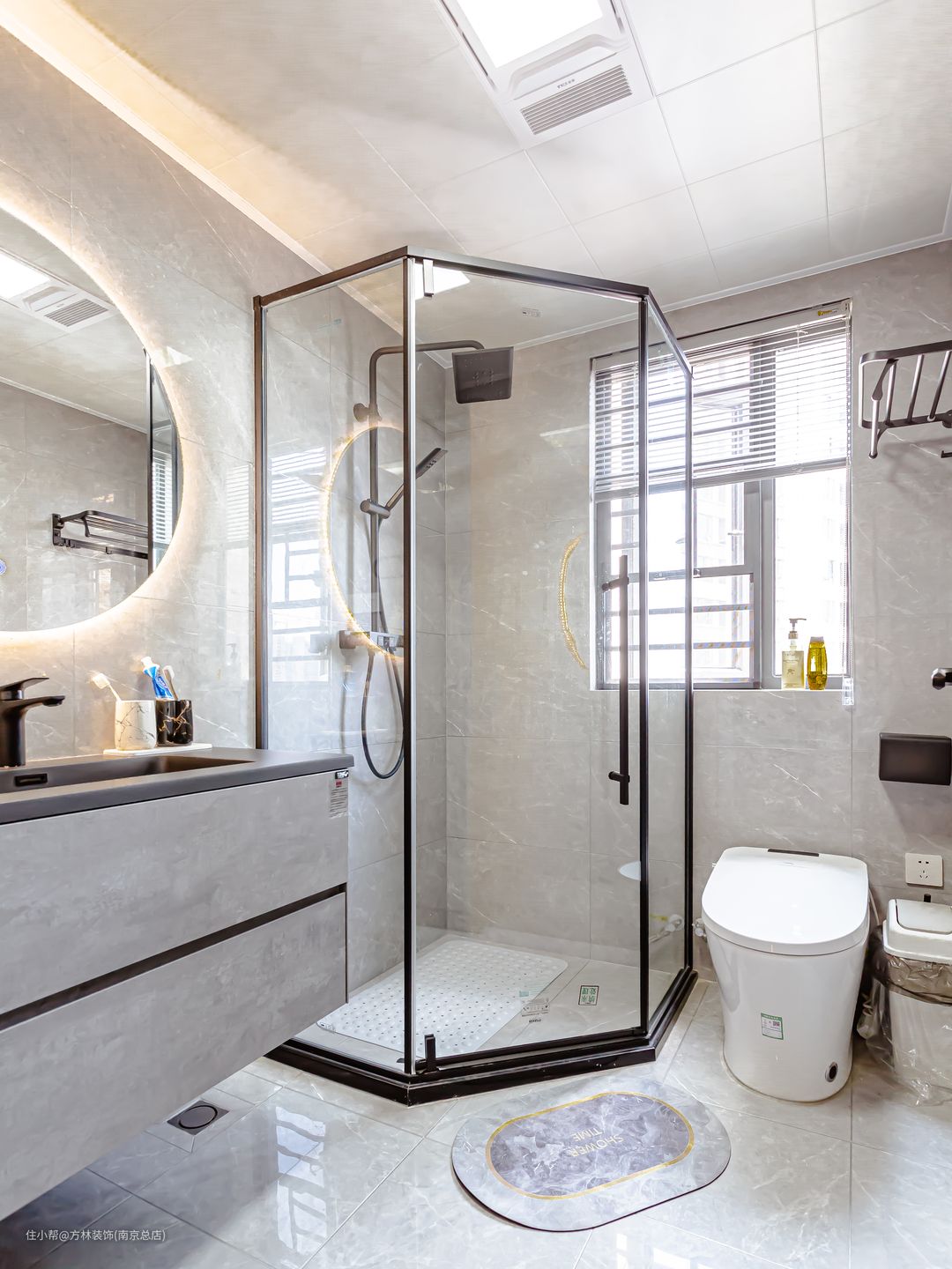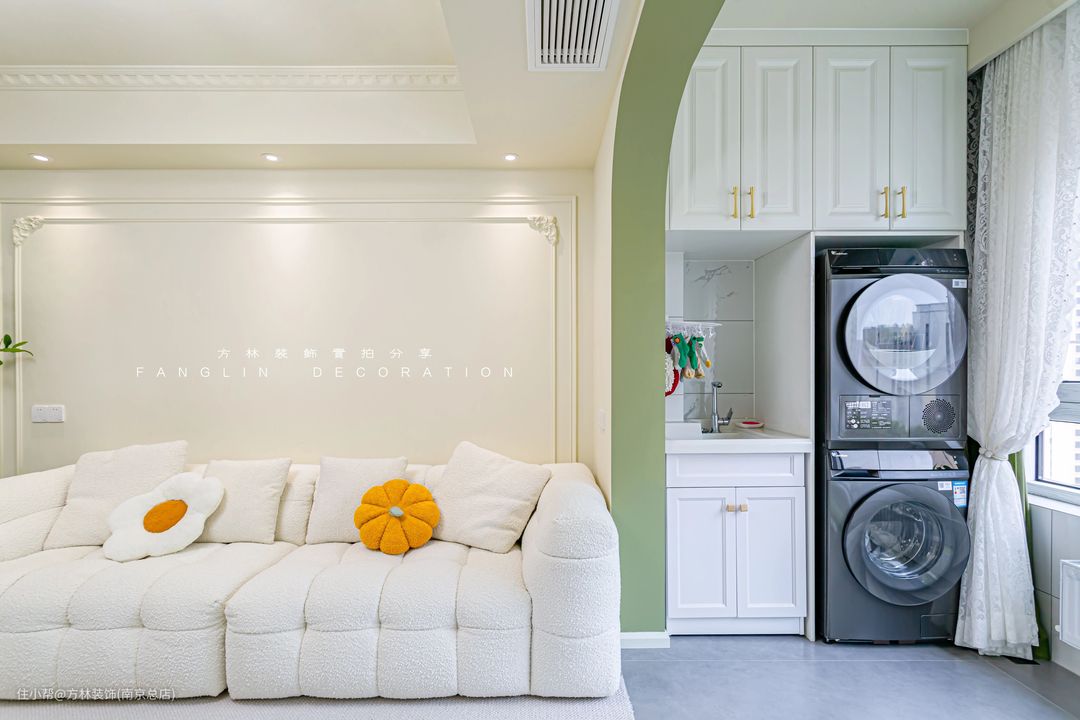 阳台客厅瓷砖通铺,宽敞显大,洗衣区设计在阳台区域,定制洗烘机一体柜,方便日常洗衣提供收纳空间,也节约了卫生间的空间。