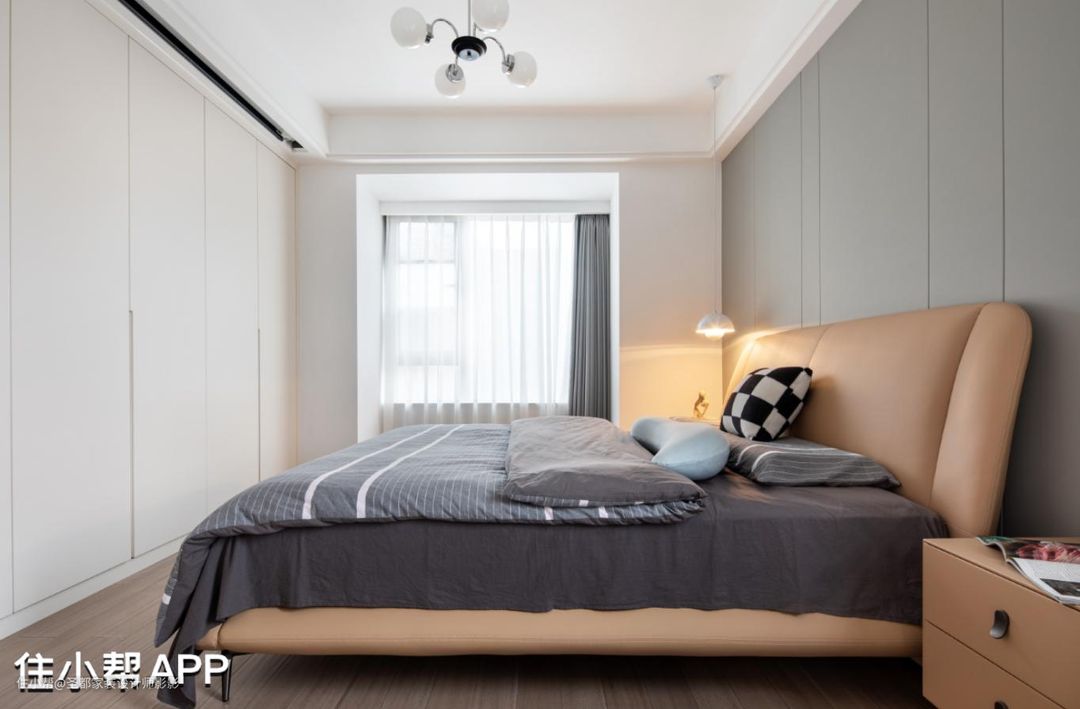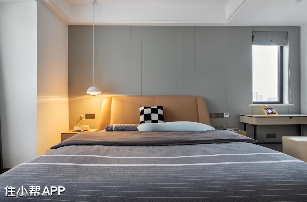 主卧以灰色为主,搭配一盏暖黄的床头灯,为这个卧室增加了一丝温暖。