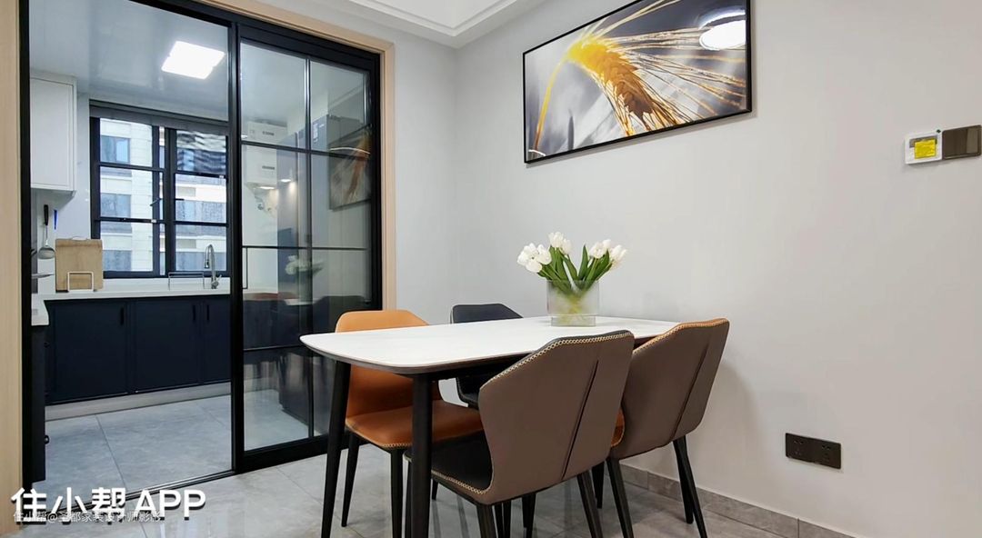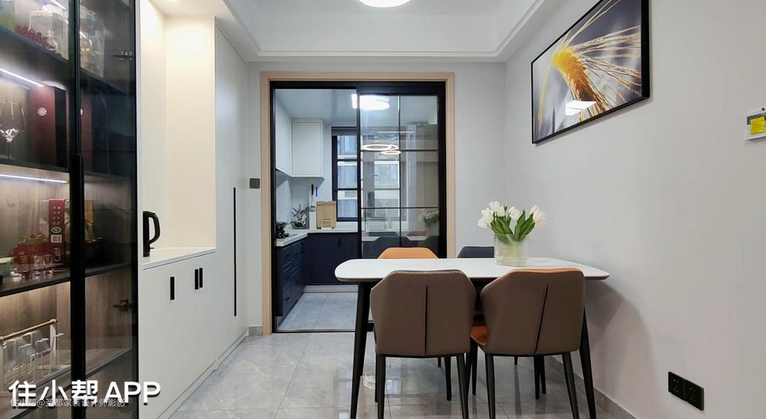 餐厅增加了餐边柜,可以收纳酒具及餐厨用品,空间整体以白色为主,简洁大方。