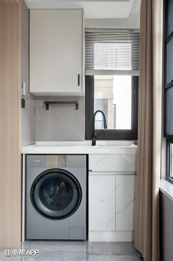 换洗区在阳台,动静分离设计可以降噪,在阳台上也更加方便晾晒