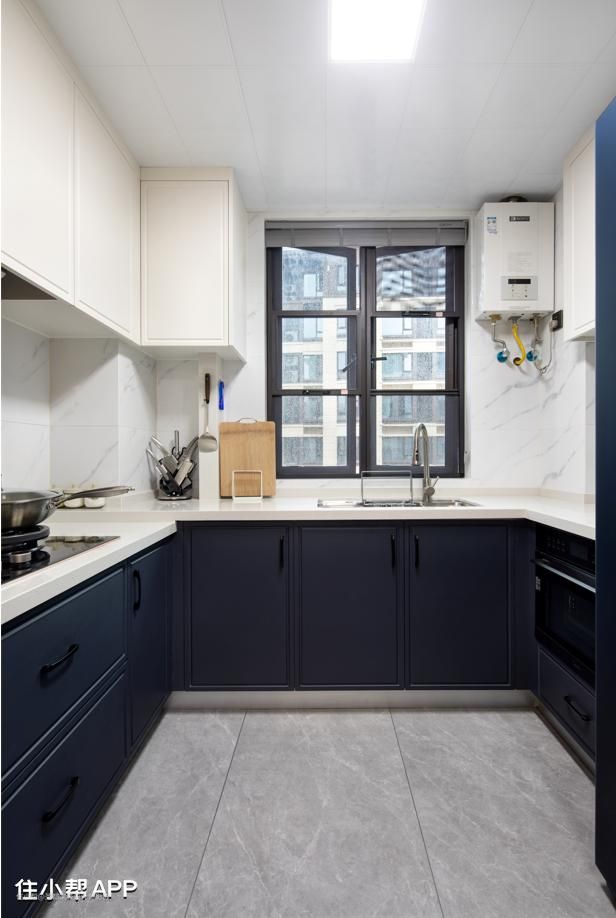 厨房根据窗户的位置,做了U型橱柜,可以收纳很多食品,满足吃货女儿。
