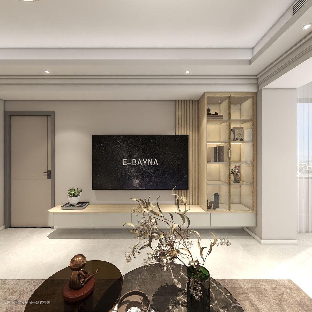 客厅的电视柜是悬空式设计,整体造型简约大方,搭配黑色的液晶电视,显得清爽自然。 电视柜右侧增加了一组玻璃展示柜,里面摆放着书籍和装饰品,在灯带的点缀下,似乎每一件饰品的背后仿佛都隐藏着一个温馨的故事。