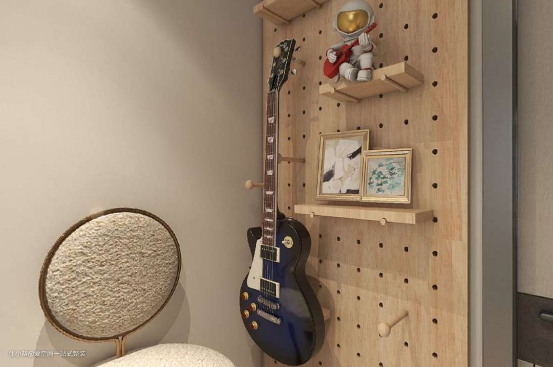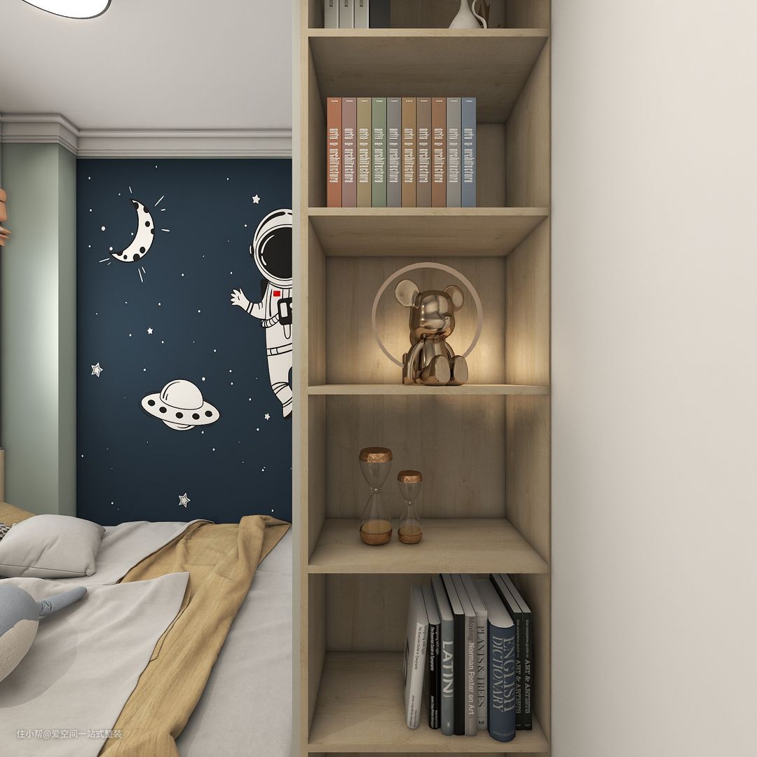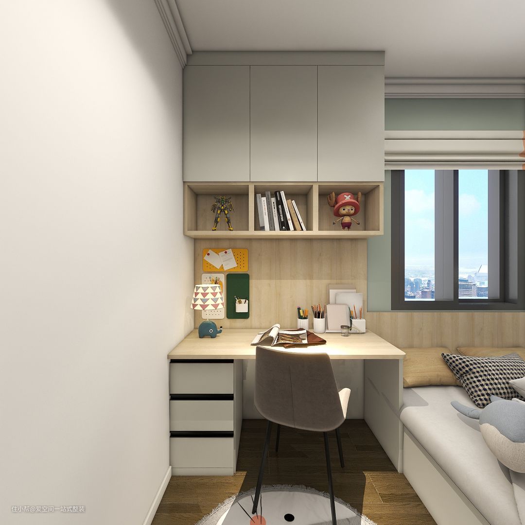 儿童房整体以白色+原木色为主,以深蓝色做点缀,打造的空间舒适又活泼。 书桌和衣柜还有床是一体化设计,空间利用率高,让孩子有充足的学习空间的同时,休息空间和收纳空间都未受到影响。