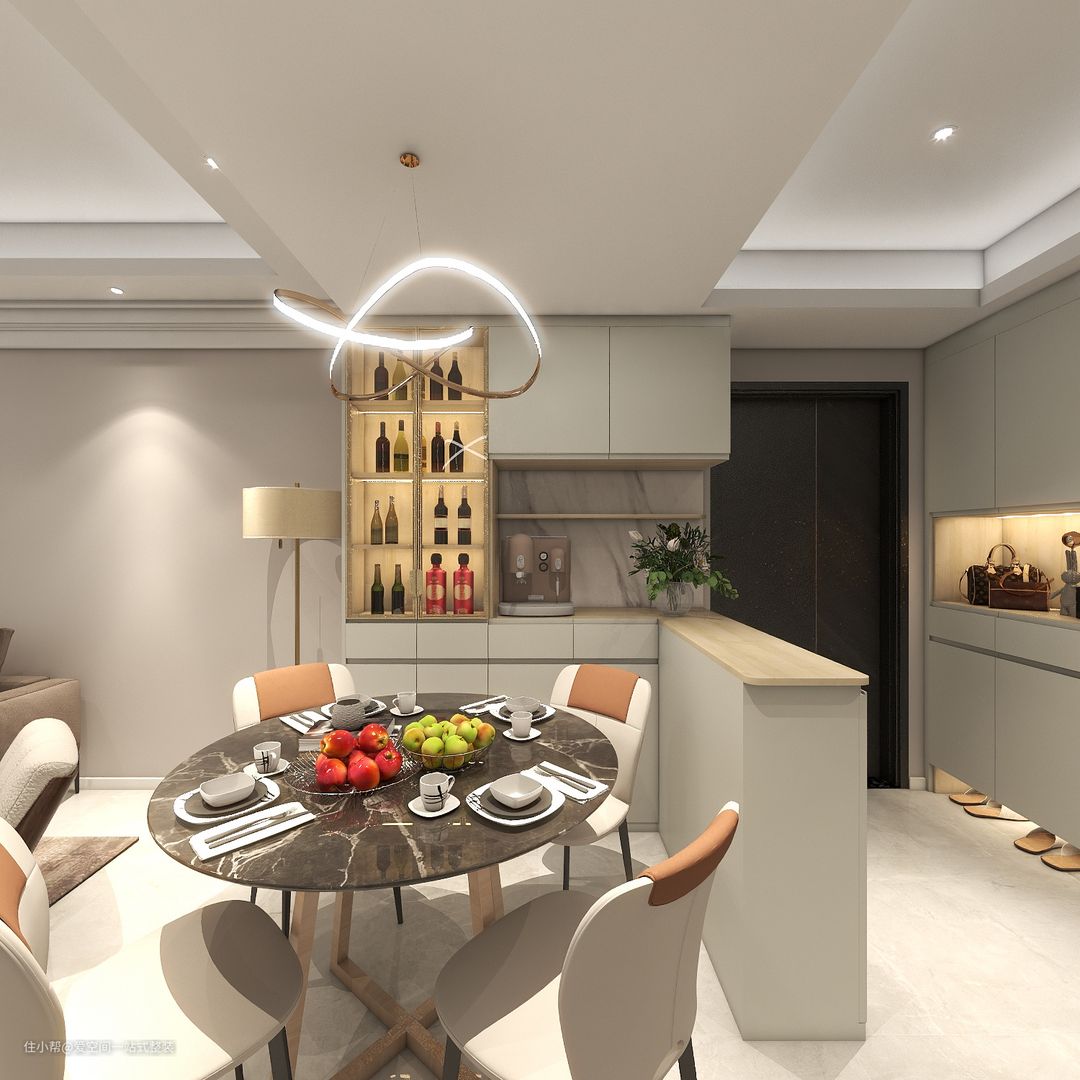 餐厅的餐桌是圆形的,大理石的台面搭配舒适的餐椅,简约时尚又不失精致。 餐桌旁的墙面是定制的整墙收纳柜,玻璃展示格中放着各种高档葡萄酒,看起来非常有格调。