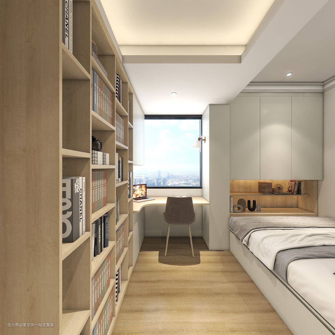 次卧是多功能房,一边是榻榻米+衣柜,可以当客房使用,另一边是整墙书架+书桌,在这里工作学习也是极好的。