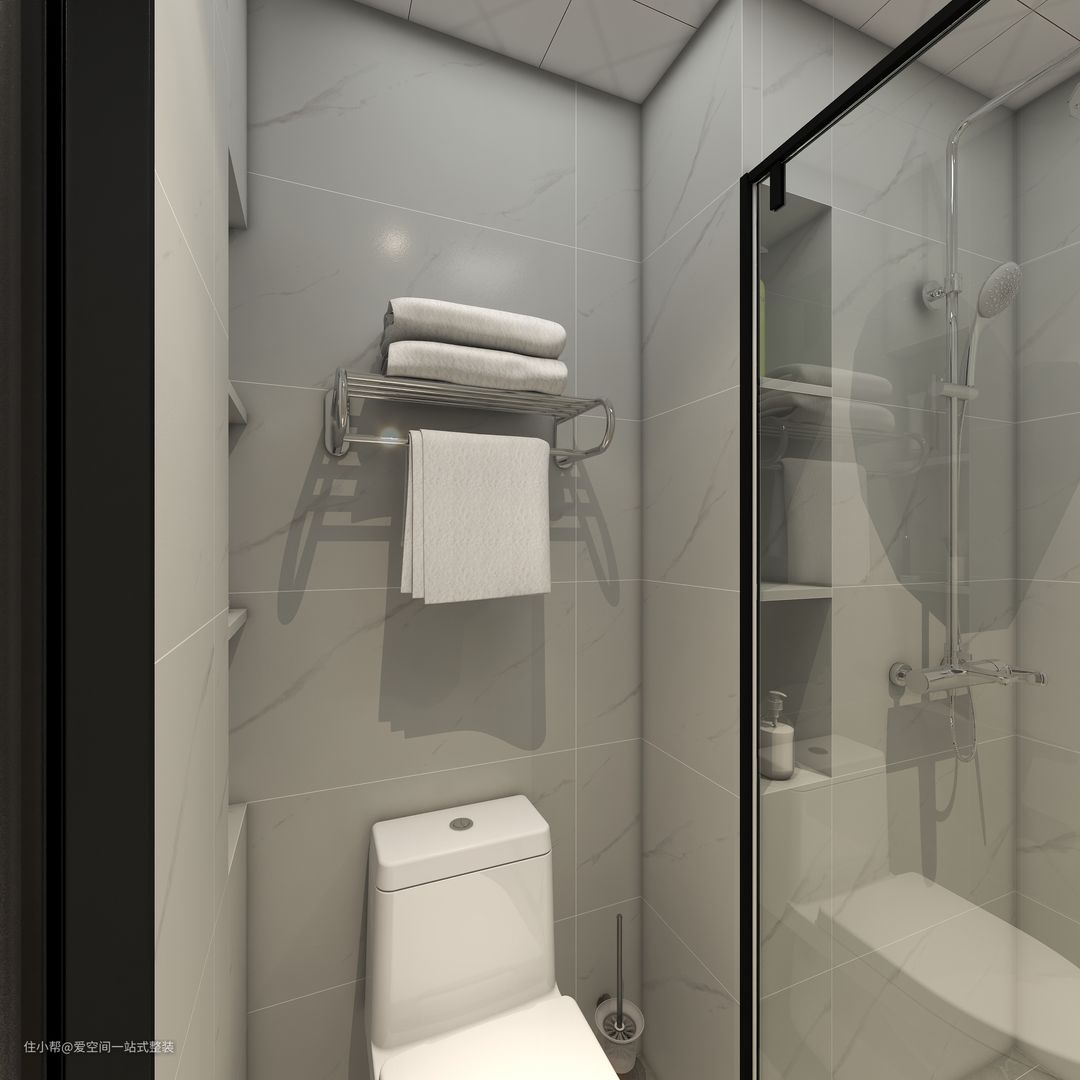 卫生间的墙面铺贴的是浅灰色瓷砖,搭配白色的洁具,整个空间显得干净又清爽。 淋浴区和如厕区用玻璃做了隔断,透明的玻璃保证了两个区域的视觉通透,加上壁龛做收纳,3㎡的空间,硬是装出5㎡的效果。