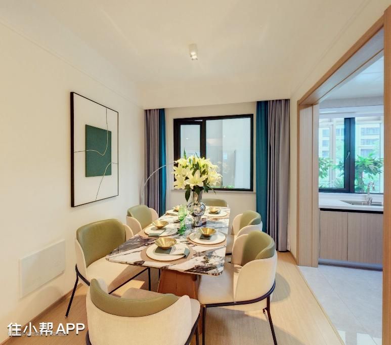 餐厅是一个家庭居室里面一起共享天伦之乐的地方,本期案例的餐厅,足够可以容纳下6人的家庭就餐或者是招待朋友一起享受美味; 餐厅的墙面上以精致壁画点缀,整体显大气。餐桌则是采用大理石纹的长桌,桌面加以奢华的餐具做中式摆盘,再搭配一瓶鲜艳的花束,整体显奢华高贵。