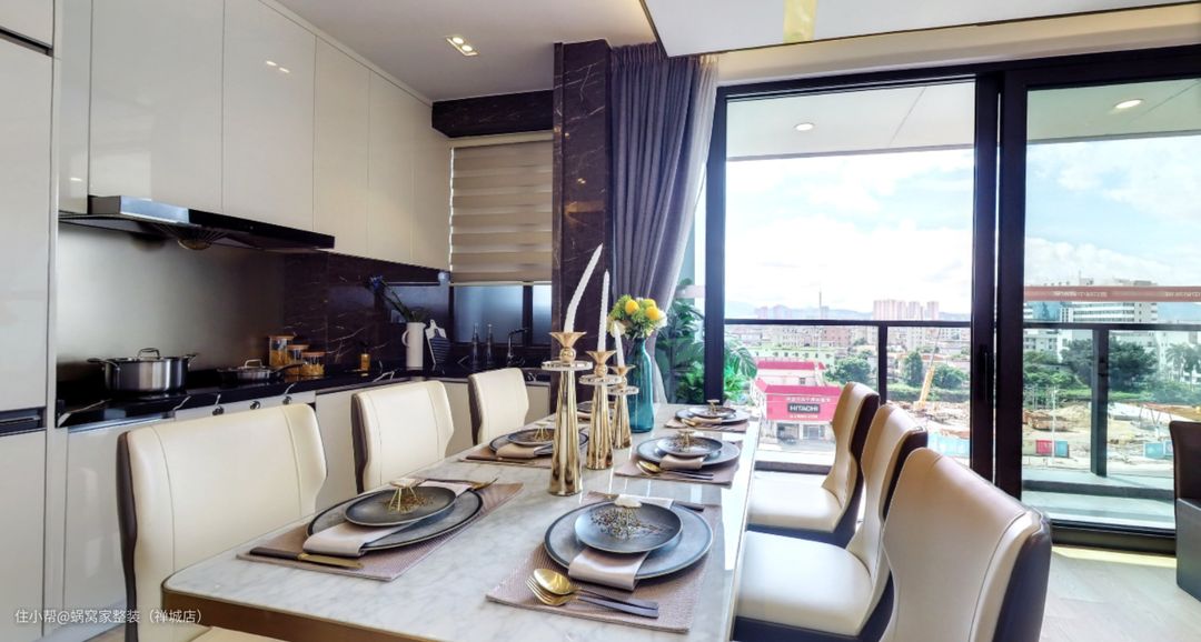 设计思路: 1、应业主需求,设计师采用餐厨一体设计,缩短餐厅跟厨房之间的生活东线,并且让厨房具有更开阔的空间; 2、用落地窗代替实体墙壁,让客厅采光更加丰富,营造出敞亮、舒适的待客空间; 3、主次卫利用加厚玻璃,实现干湿分离,给业主带来更好的卫生间使用体验,同时在两个卫生间洗漱区都采用镜柜+壁龛的结合,为业主提供了充足的收纳空间。