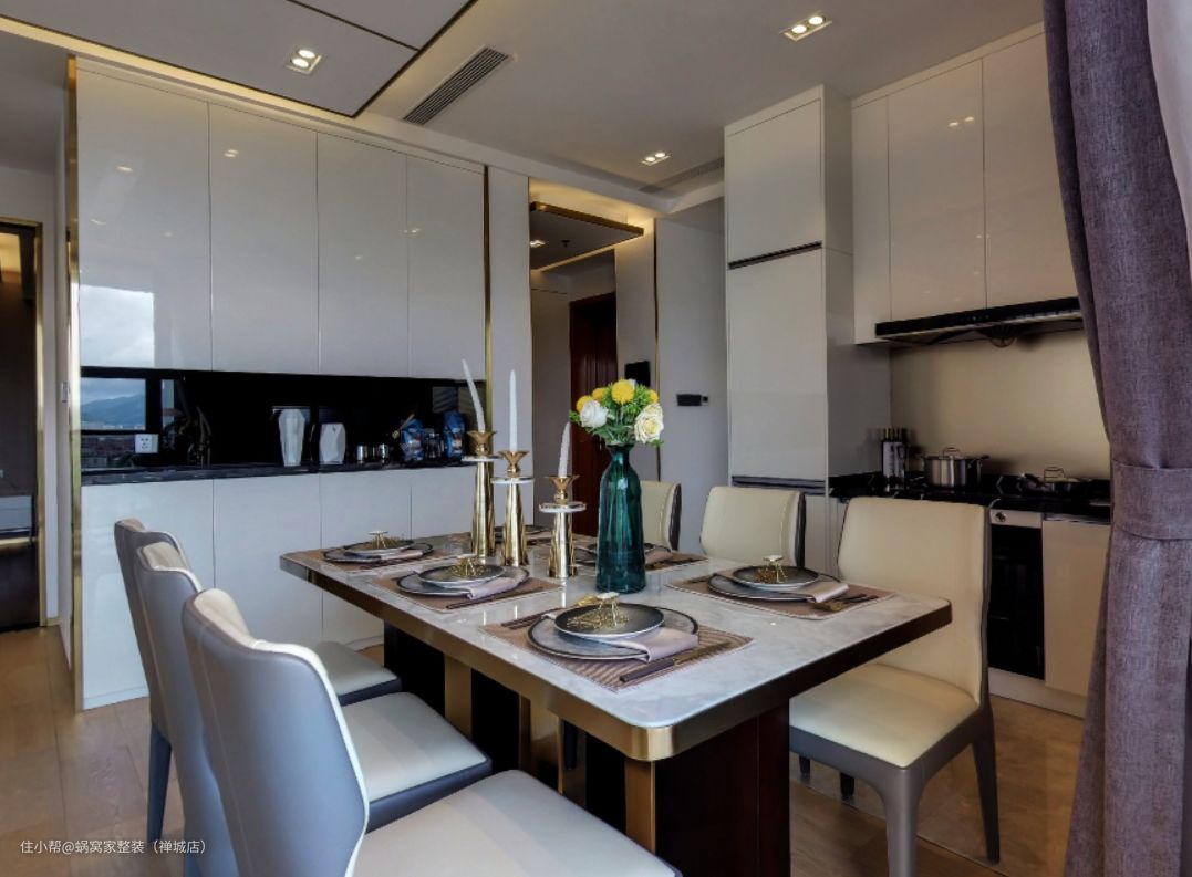餐厨一体的布局,拉进厨房跟餐厅之间的距离,让上菜更方便。 白色系的厨房空间,更显通透,搭配米色系的餐桌椅,拉伸整体用餐格调;光滑的大理石材质的桌面,让日常打扫卫生更加便捷。