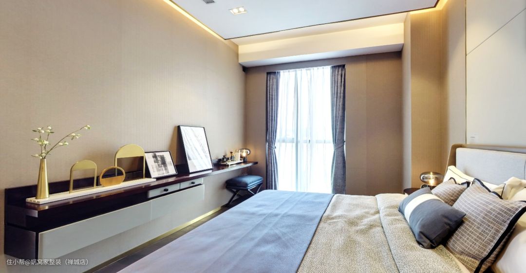 整个次卧采用极简风格,背景墙配色简约且不失设计感,在加上两条金色装饰线条,奢华富有格调。 在这个手机不离手的时代,床头柜的加入,更方便我们睡前置物、手机放置,满足收纳需求的同时还保持了空间的干净整洁。