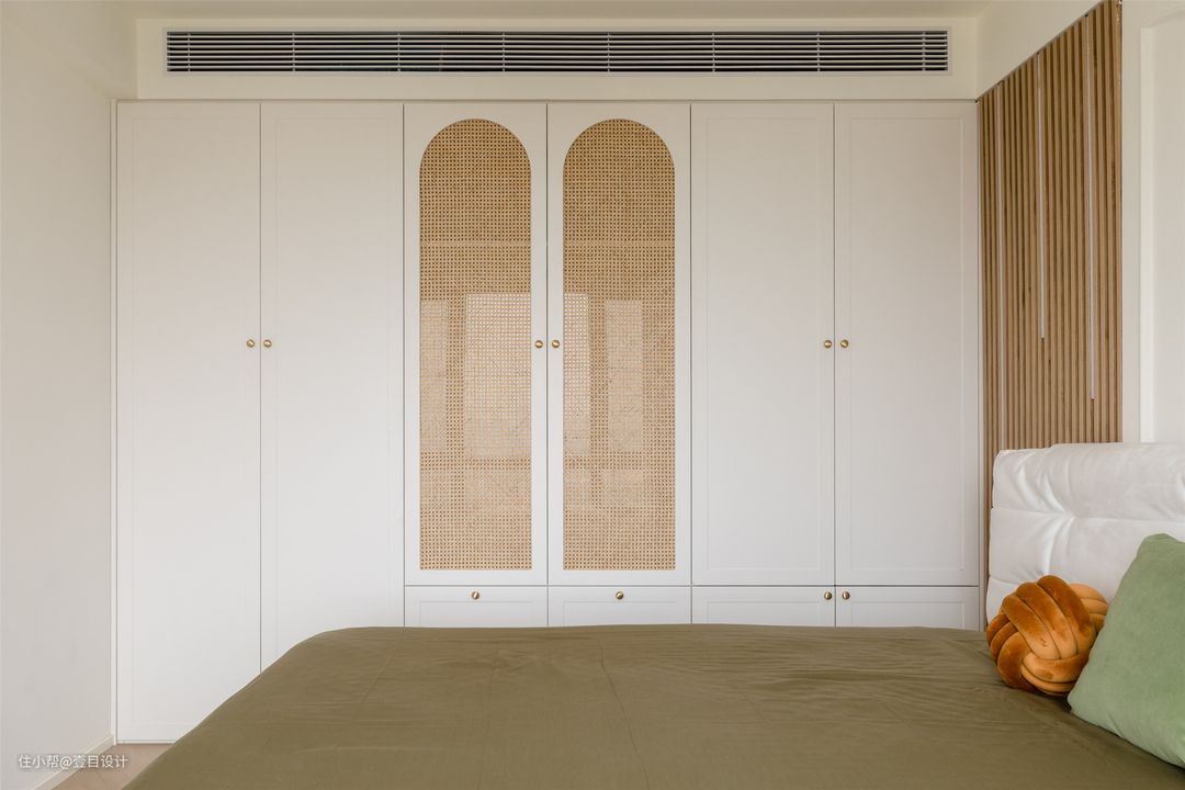 主卧以纯白、原木为底色,澄净明澈。铺陈整墙的衣柜,嵌入贴合,一气呵成,穿插的藤编柜门,藏而不露,透气性极佳,削弱了整柜的封闭厚重感,轻盈小巧的黄铜把手点缀其间,更添了一分精致轻奢感。