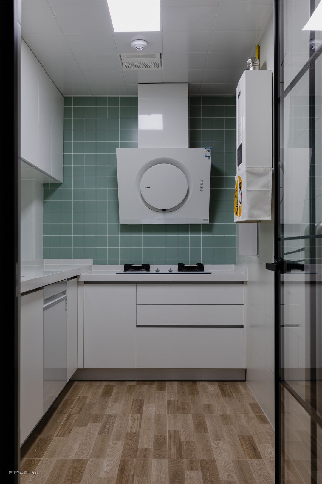 L型中厨的吊顶、橱柜均为白色系,空间整洁明亮,烹煮区用明快的小绿砖做背景,缓解长期处于纯色空间的视觉疲劳感。从人体工学的角度考虑,厨房设计了高低台面,帮助屋主减轻了家务的压力。