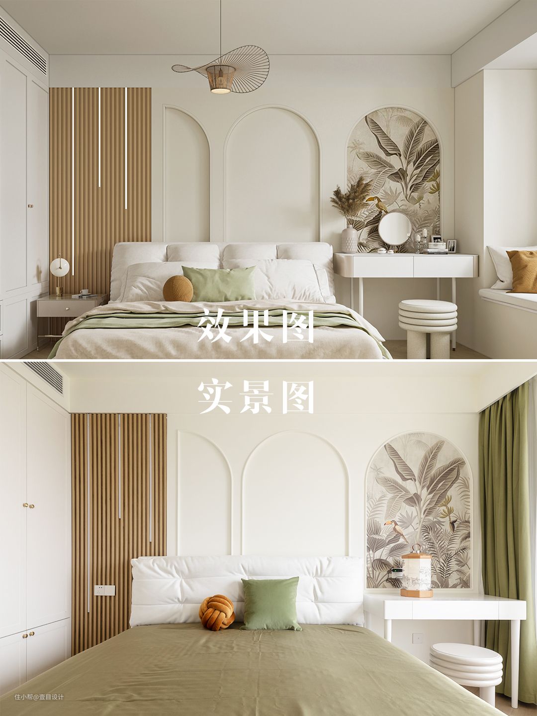 主卧床头背景墙,再次出现连拱造型,与餐厅形成连贯的呼应。内置线性灯的长城板与热带绿植壁纸,分列床头左右,自成一脉风景,床头层次丰富而不凌乱。床头左侧空间预留有限,衣柜采用分层设计,方便屋主更自在拿放衣物。 梳妆台被安置在临近飘窗的床头一侧,屋主可以在自然光下描画妆容,以更好的状态出游或迎接新一天的工作。